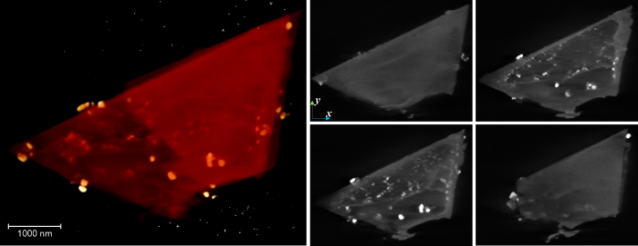 Figure 2. Left: A screenshot image depicting the volume-rendered 3D reconstruction of a nickel siloxene composite particle synthesized using ethanol as solvent. Right: Four images of slices obtained at different z depths of nickel silioxene particle, definitively indicating that the nickel nanoparticle guests are confined internally within the siloxene host.