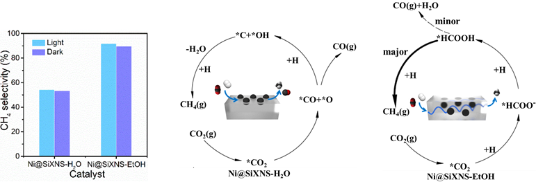 Figure 3. Left: CH4 selectivity of nickel silioxene samples for CO2 methanation under light and dark conditions. Right: Catalytic CO2 reduction pathways for nickel siloxene samples made in H2O and in EtOH showing key reaction intermediates detected by DRIFTS.