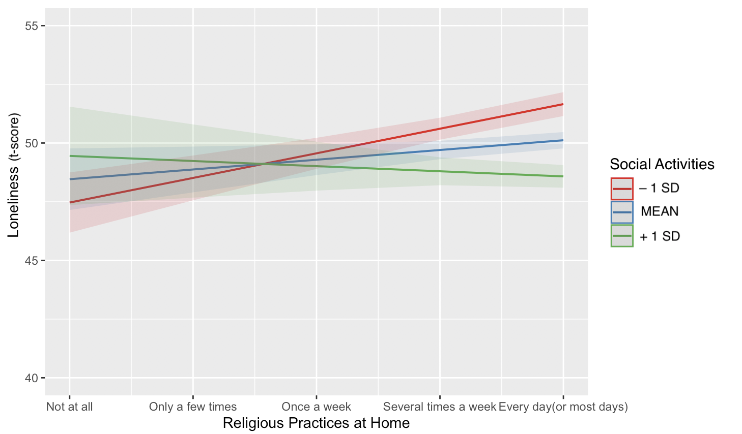 Another interesting finding was the relationship between religious belief, practices, and activities with loneliness. Whereas the interviews showed that being religious motivated older people to participate in community activities and be socially integrated, others felt lonely because they could only engage in religious practices at home (e.g., praying and meditating) due to underlying health constraints, which makes sense of the interaction that showed that religious activity at home predicted higher loneliness for people unable to attend social activities (see Figure below). Nevertheless, religious activities, such as praying and meditating were one of the main strategies used to cope with loneliness in Myanmar.