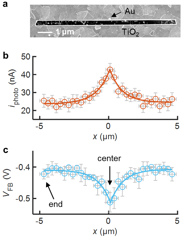 Figure 2. (a) SEM image of a representative Au/TiO2. (b,c) Sub-particle photoanodic current iphoto at an applied potential of 0 V vs. Ag/AgCl (b) and sub-particle VFB of the Au/TiO2 nanostructure Solid lines: bi-directional exponential fitting.