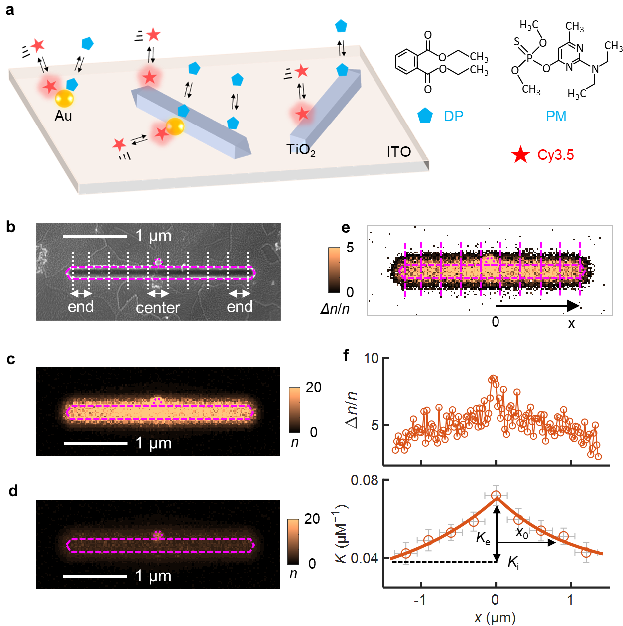 Figure 1. (a) Illustration of adCOMPEITS and experimental design. DP: diethyl phthalate. PM: pirimiphos methyl. (b) SEM image of a representative Au/TiO2 nanostructure. Vertical lines dissect the TiO2 nanorods into 300 nm segments lengthwise. (c,d) 2D histograms of single-molecule localizations of reporter fluorophore Cy3.5 adsorption on a single Au/TiO2 nanostructure in the absence (c) and presence (d) of PM. Magenta-dashed line: structural contour from SEM in b. (e) AdCOMPEITS image derived from delta_n/n = (n0−n)/n between c and d. (e) 1D projection of the adCOMPEITS image of the TiO2 nanorod (upper) and the fitted K of individual TiO2 segments (lower) as dissected in e. Solid red lines: bi-directional fitting with . Ke, Ki, and x0 reflect the adsorption enhancement amplitude near the Au-TiO2 interface, the intrinsic adsorption equilibrium constant on the side facets of TiO2, and the decay distance constant of the adsorption enhancement, respectively.