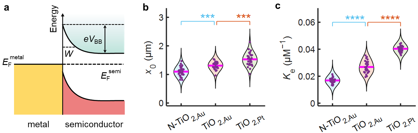 Figure 3. (a) Schematic showing the band bending of semiconductor induced by metal-semiconductor contact. eVBB = EFsemi - EFmetal , where and are the Fermi levels of semiconductor and metal, respectively. (b,c) Violin plots showing the effect of N-doping of TiO2 and Pt as the cocatalyst on the long-range adsorption enhancement parameters: x0 (b) and Ke (c). Magenta lines: mean values. ***p < 0.001; ****p < 0.0001; paired student’s t test.