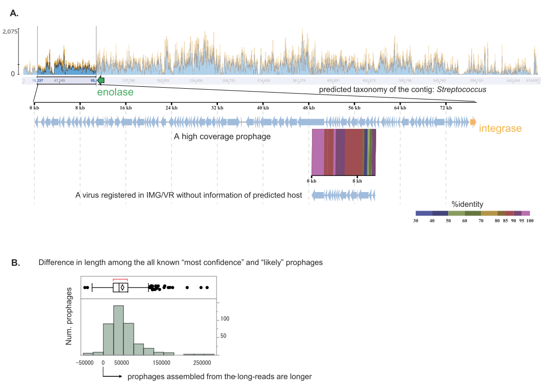Figure 1. Improved scaffolding and host genomic context compared to the viral sequences assembled from short-reads. (A) A high coverage oral prophage showing the improvement. Top: coverage plot based on mapping short-reads against it. The prophage region is indicated as a rectangle in the coverage plot spanning the entire contig.Genomic alignment of a high coverage prophage and its viral sequence registered in IMG/VR v2.0 database is shown. (B) Distribution of the differences in length between each of the "most confidence" and "likely" prophages and their corresponding viral sequence in the IMG/VR v2.0 database.