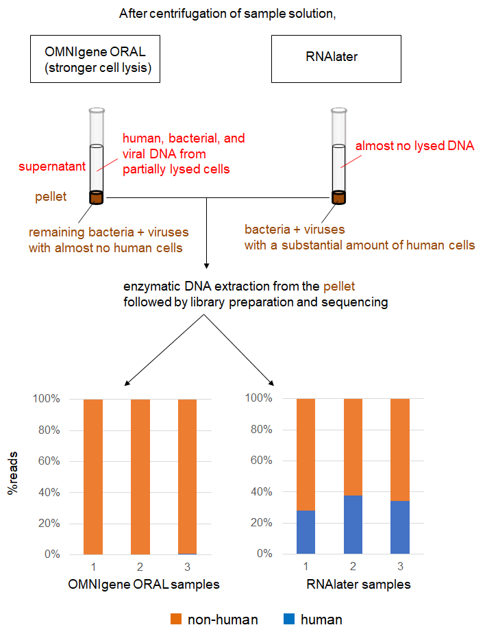 A key to these discoveries was DNA extraction by the enzymatic lysis method4, which is useful for isolation of high molecular weight DNA sufficient for long-read metagenomic sequencing. Unexpectedly, we observed a small percentage of human reads during metagenomic sequencing of DNA extracted from salivary samples stored using the OMNIgene ORAL kit. Honestly it was really a puzzle, but during the revision of the manuscript, we conducted an additional experiment comparing with that from the same samples stored using RNAlater (Figure 3), and succeeded in explaining the reduction of human DNA contamination.