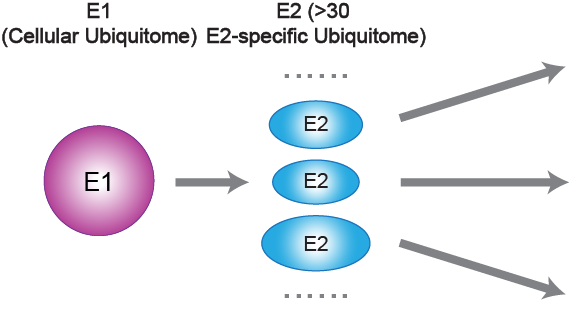 Figure 2. The entire ubiquitin pathway (entire ubiquitome) can be further subdivided into more than 30 E2 sub-pathways (E2-specific ubiquitome) based on E2 enzymes.