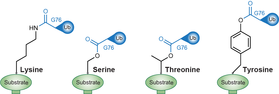 Figure 1. Representative protein ubiquitin conjugations, from left to right: known lysine ubiquitination, serine ubiquitination, threonine ubiquitination and the unknown tyrosine ubiquitination.