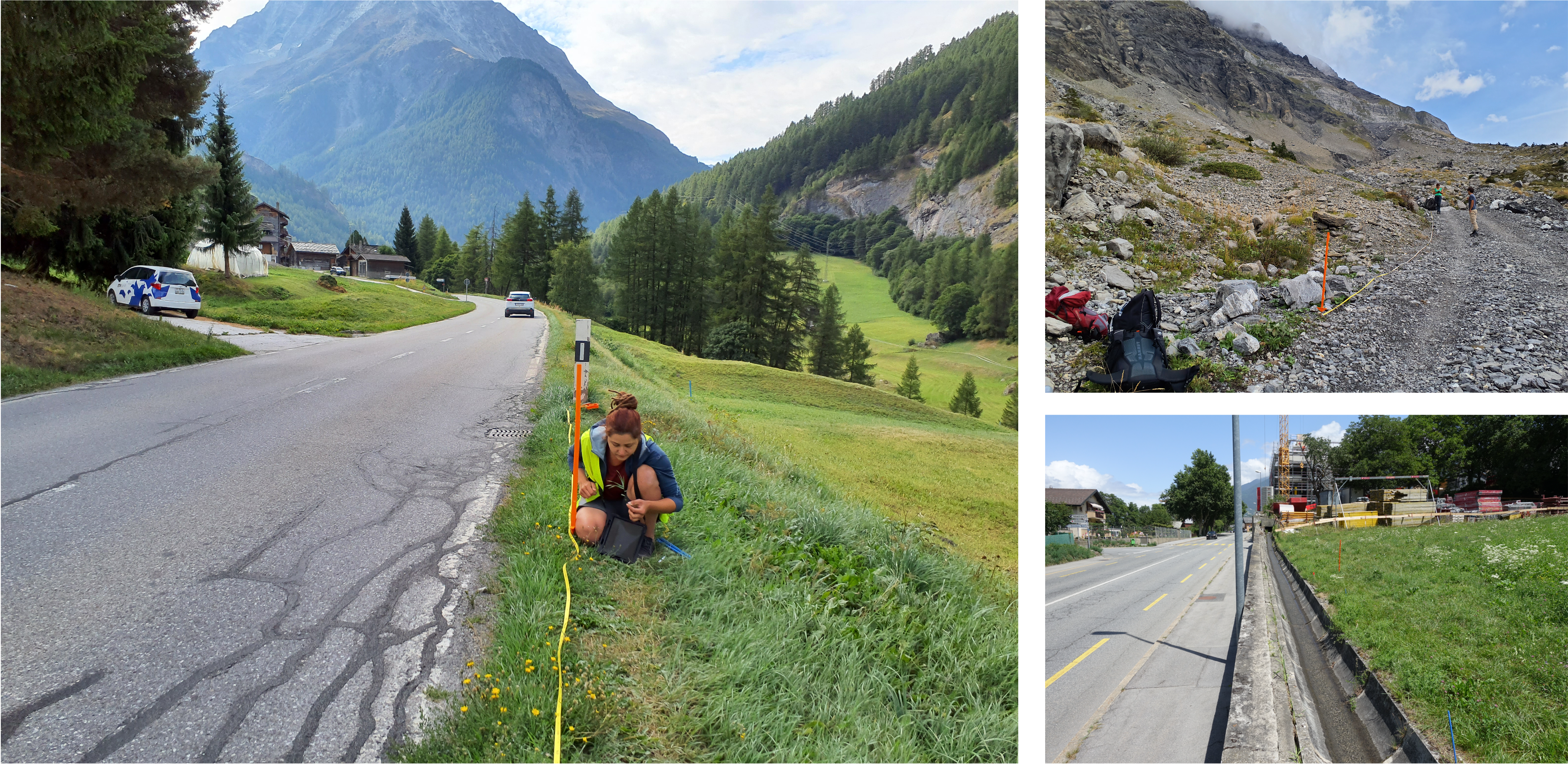 Figure 3: MIREN vegetation survey in Switzerland 2022. Left: Camille Brioschi identifying one of the approximately 600 plant species recorded in Switzerland in 2022 alongside one of the three Swiss roads. Right: One of the highest transects in Switzerland (top) versus one of the lowest transects, showing the great variation in vegetation (picture credits: Camille Brioschi, Fiona Schwaller).