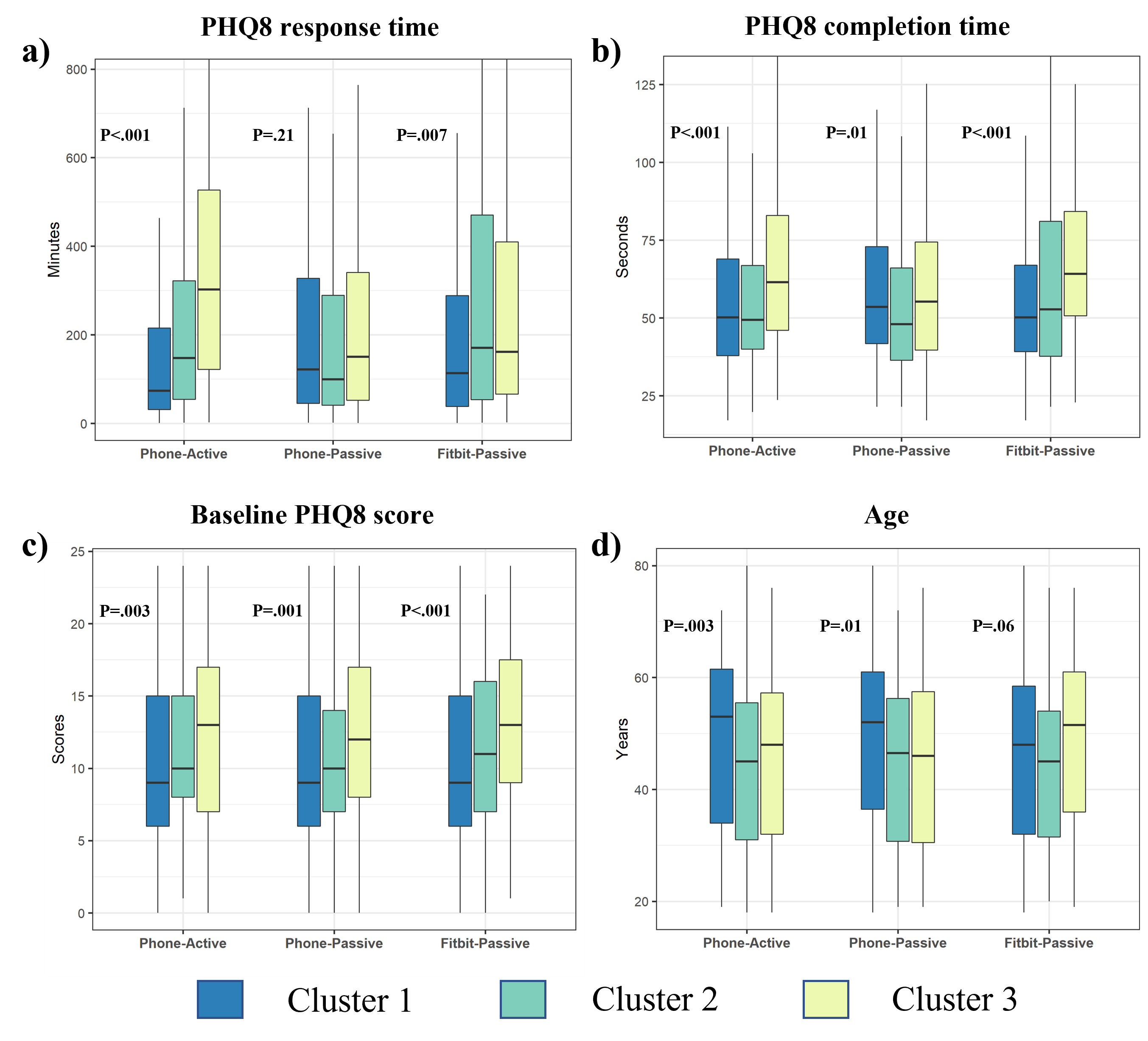 Across the three engagement clusters in each data stream, we found notable differences in participants’ behavior (survey response and completion times), baseline depression symptom severity, and age (Fig 3).