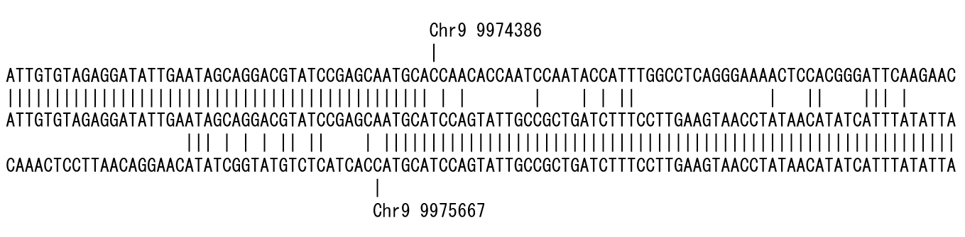 Figure 2 is the result of placing the short read sequence in the middle row and aligning the genome reference sequence from the 5' end side in the upper row and the 3' end in the lower row. The position where the mismatch occurred is shown up and down. In this example, a deletion of approximately 1.3 kb could be detected.