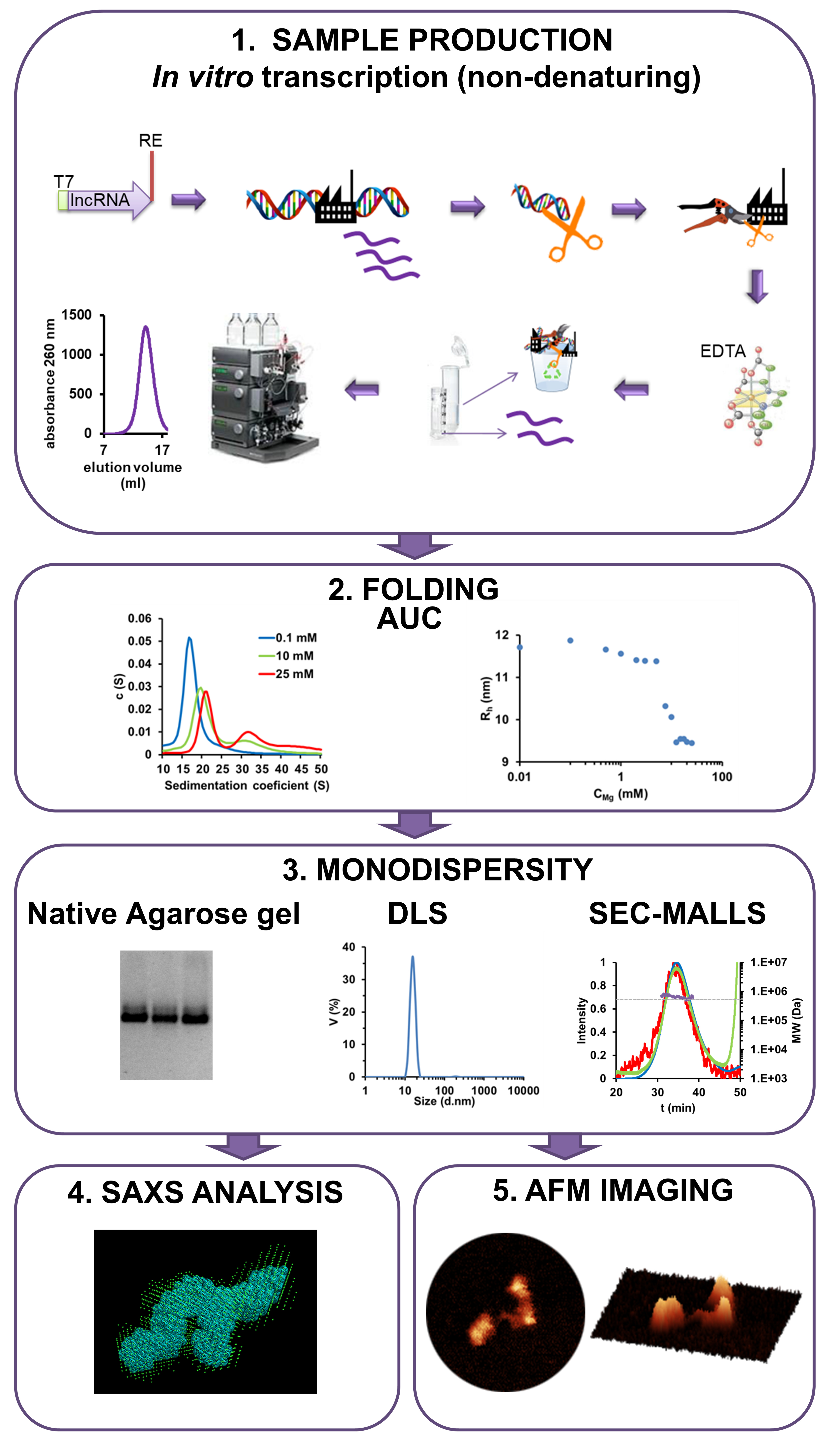 We thus designed this protocol to produce MEG3 by non-denaturing in vitro transcription, to determine appropriate folding conditions by analytical ultracentrifugation (AUC), to assess its monodispersity by electrophoresis and light scattering (MALLS, DLS), and finally to image it in 3D by small-angle X-ray scattering (SAXS) and atomic force microscopy (AFM). By applying this protocol, we were able to capture structural differences between active wild type MEG3 and inactive mutants with disrupted pseudoknots, providing for the first time a molecular visualization of functional and non-functional lncRNA particles. Our protocol thus constitutes a fundamental step forward onto the characterization of physiological 3D structural conformations of lncRNAs.