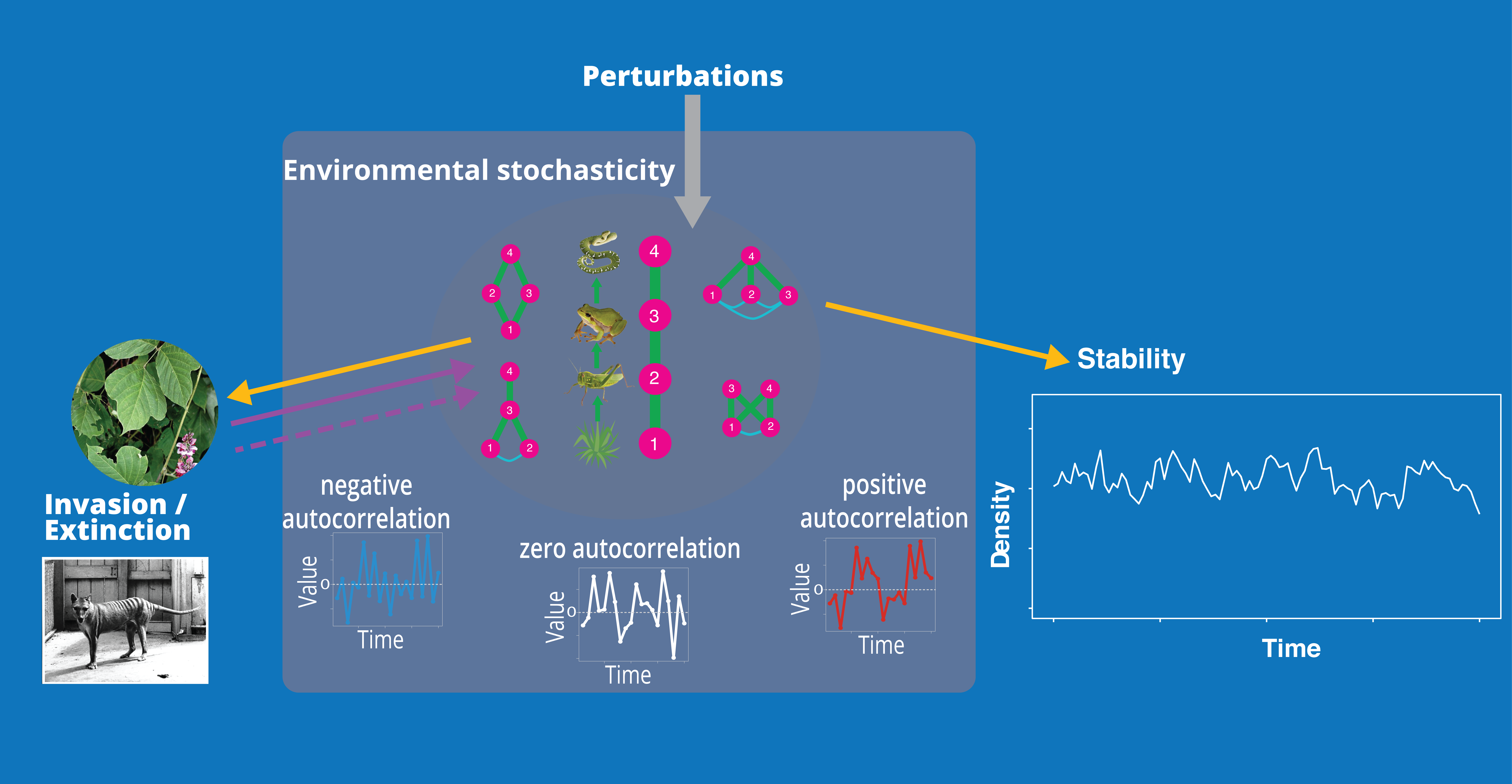 My Ph.D. research started by investigating how the correlations between different stability components respond to different intensities of single perturbations. When talking about this project to people, I have been asked the same question many times: natural ecosystems seldom experience only one large perturbation but undergo continuous environmental variations. This encouraged me to recall my first impressions of the Irish weather and to think about the patterns of perturbations in nature. Extreme climatic events and single, static levels of globally-important disturbances such as global warming, fragmentation, and nutrient enrichment have tended to be the focal disturbances of choice for ecosystem-level studies of environmental change. Many of my ecologist friends have talked with me about how they set the temperature in the treatment several degrees higher to study the impacts of warming on ecosystem structure, functioning, and stability. One good reason for taking such a static experimental approach is, of course, the reduced (though still significant) requirement for energy and time. Yet, this approach inevitably overlooks the variations around the main trends in environmental conditions, which may accumulate to exert a large effect on natural systems or, indeed, cancel each other out. So how might the pattern of these variations determine the stability of populations and communities? While many interesting effects of environmental variation, particularly that of its temporal autocorrelation pattern (that is, the colour of the noise) on populations have been identified, how these patterns act to regulate stability at the community level was unclear.
