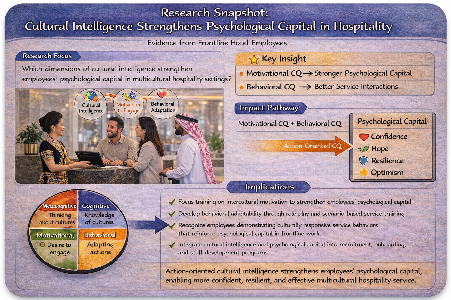 Our recent study explores this question by examining how cultural intelligence (CQ) contributes to psychological capital (PsyCap) among frontline hotel employees in Kota Kinabalu, Sabah, Malaysia. In particular, the research investigates which dimensions of cultural intelligence most strongly support the psychological resources employees rely on when interacting with culturally diverse guests.
