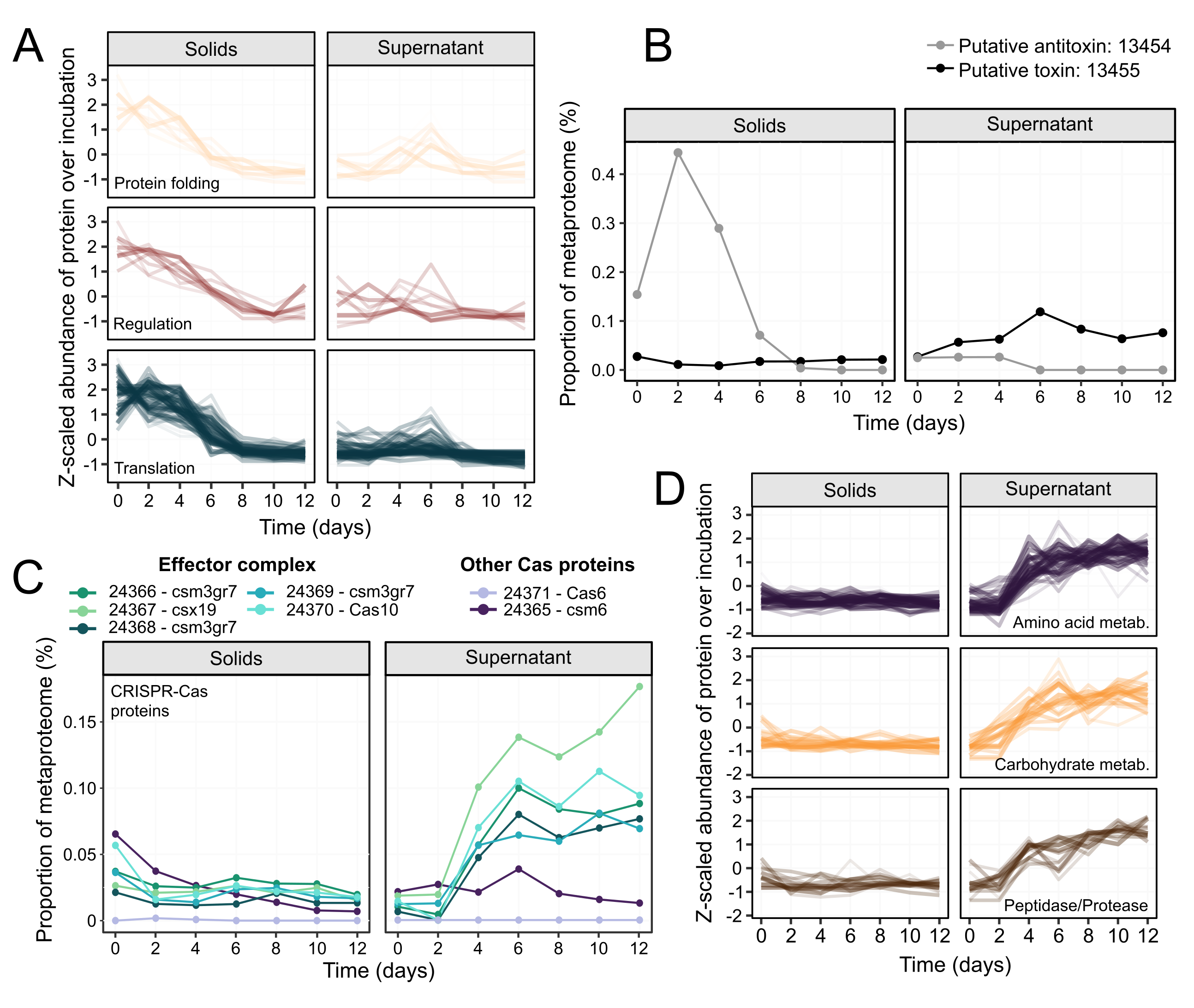 Figure 3. Dynamics of Ca. P. alkaliphilum proteins over the course of the incubation. Proteins from functional categories that were significantly more abundant in the solids fraction before cell lysis (A). Metaproteome abundance of the prospective toxin-antitoxin protein pair over the incubation (B). Abundance of proteins located in a CRISPR-Cas operon that were significantly enriched in the supernatant post-lysis (C). Proteins from functional categories that were significantly higher in abundance in the post-lysis supernatant fraction (D).