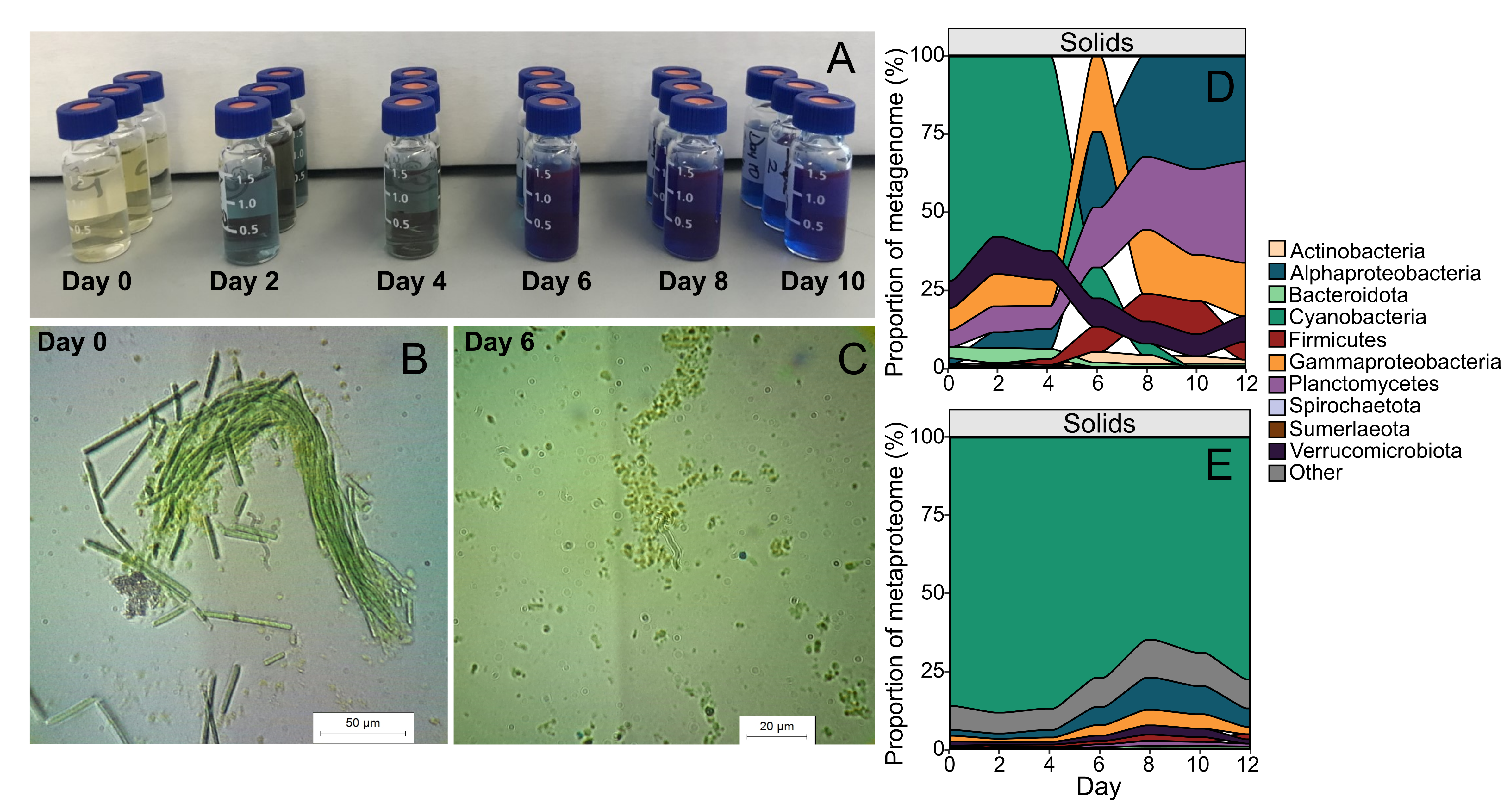 Although we could observe that the cells were lysing, the mechanism for this phenomenon remained elusive. We decided to systematically investigate this process by incubating the culture in dark and anoxic conditions for 12 days. We took samples every two days from the culture biomass (solids) and the liquid media (supernatant). For each sample, we measured phycocyanin concentration, and performed metagenomics and metaproteomics to observe the microbial community dynamics at the level of DNA and protein respectively. We had three main hypotheses for cause of death: 1) the cyanobacterial cells died from predation or antagonism by neighbouring bacteria or protists, 2) the cyanobacterial cells died from viral infection, and 3) the cyanobacterial cells died from a programmed cell death response.