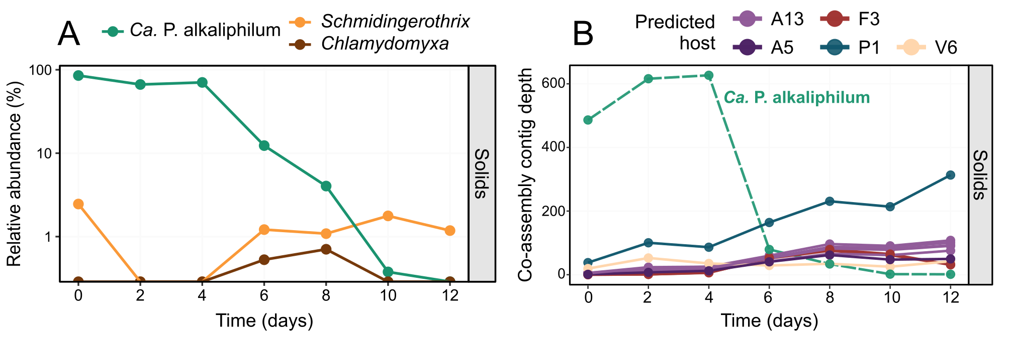 Figure 2. Dynamics of protist and viral sequences during incubation. Relative abundance of Ca. P. alkaliphilum (green) and the two protist species identified (orange and brown), over the course of the incubation (A). Abundance of viral associated contigs over the incubation coloured by their potential bacterial host (B). A13: Rhodobacteraceae, A5: Pararhodobacter, F3: Alkalibacterium, P1: UBA6054 (genus of Planctomycetota), V6: Verruco-01 (family of Verrucomicrobiota). The green dashed line shows the average contig depth for the Ca. P. alkaliphilum co-assembly MAG over the same samples.