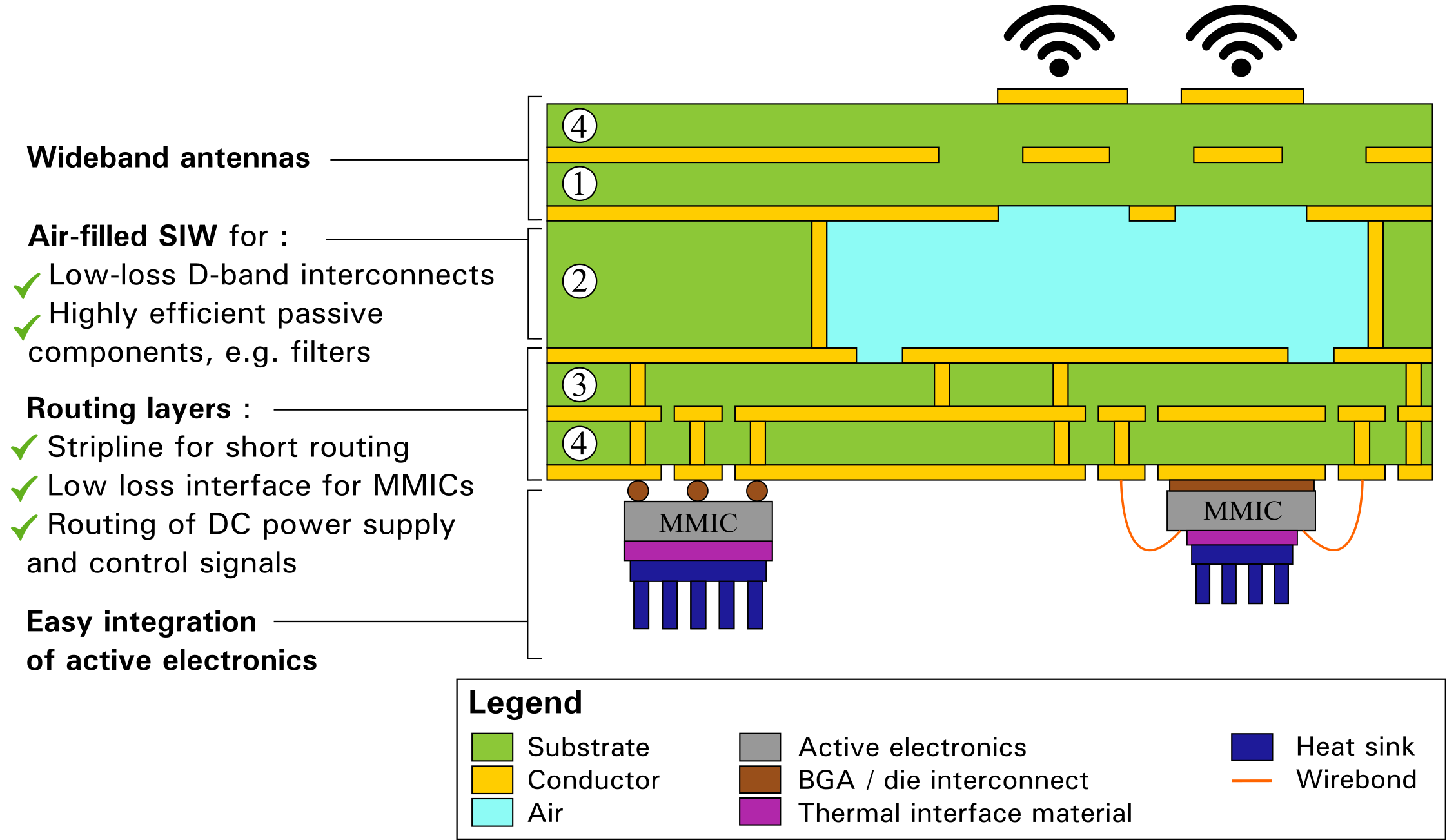 The printed circuit board (PCB) technology, omnipresent in all of our current tech devices, is popular for good reason. It has always offered a cost-effective, mass-manufacturable solution that features easy integration of integrated circuits (ICs) without introducing significant amounts of losses. However, progressing towards frequencies beyond 100 GHz not only increases the dielectric losses, but also the impact of the conductor’s surface roughness. Moreover, in the terahertz frequency band (100 GHz – 10 THz), adequate performance of typical PCB laminates has not yet been thoroughly verified, nor have viable alternatives been identified or developed. Additionally, the use of antenna arrays with tens, or even hundreds, of elements, which are essential to provide sufficient signal strength despite the free-space path loss, requires a more elaborate routing network. This inherently increases the total amount of losses, ultimately limiting the maximum achievable antenna array gain. To mitigate this overall increase in losses, we have proposed the development of a multi-layer PCB stack in cooperation with AT&S, an Austrian manufacturer of high-end PCBs, including an air-filled substrate integrated waveguide (AFSIW) routing layer with smooth copper walls to reduce feed network losses to the bare minimum, as presented in Figure 1. What is so great about this proposed technology?