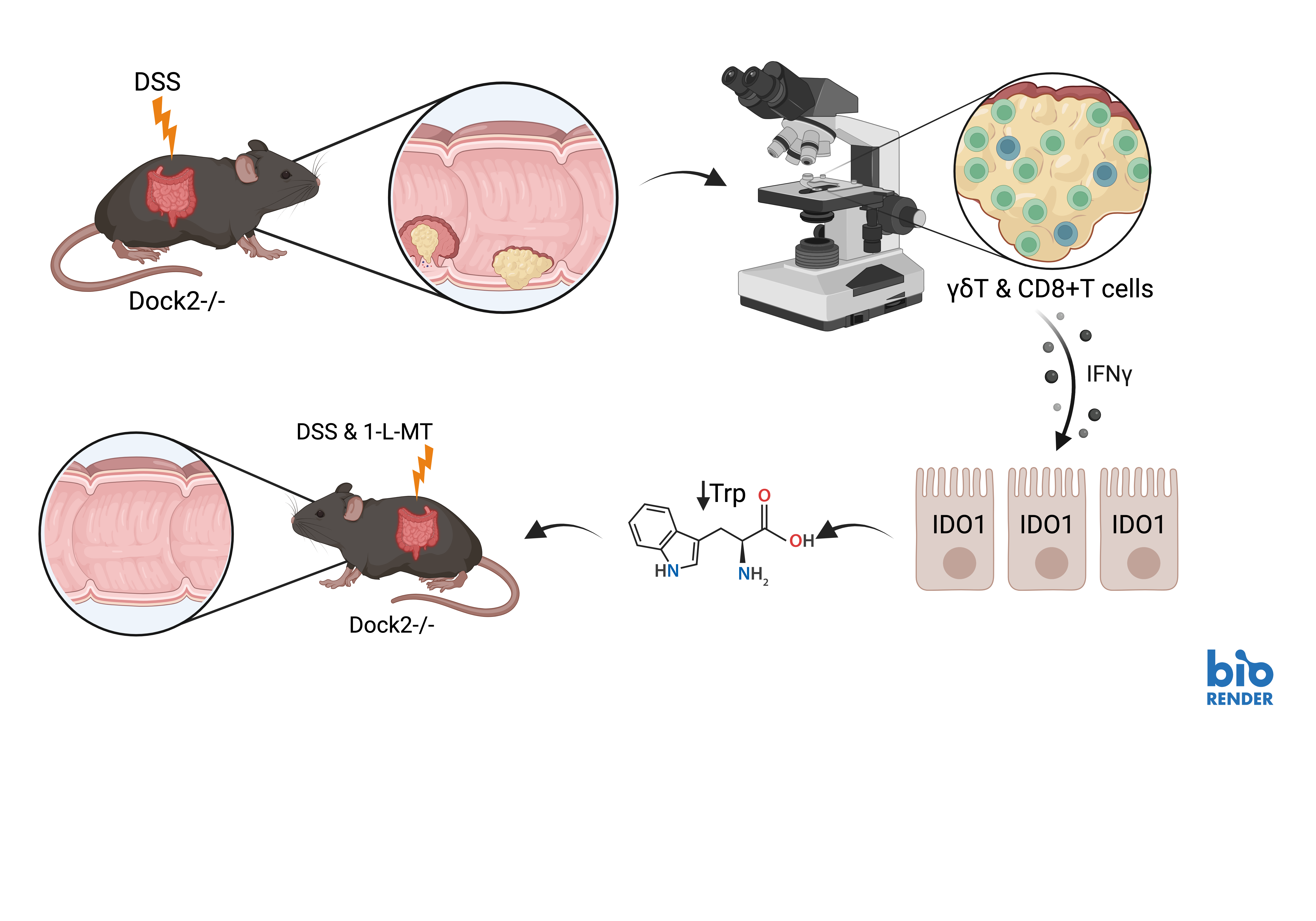 Loss of DOCK2 potentiates Inflammatory Bowel Disease–associated colorectal cancer via immune dysfunction and IFNγ induction of IDO1 expression