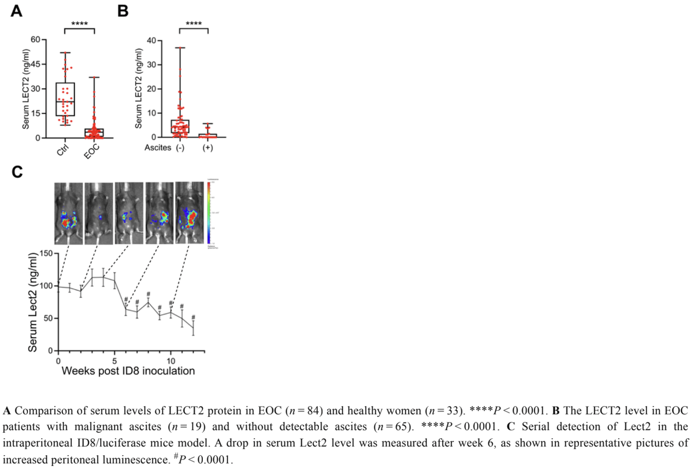 The amount of circulating LECT2 in the serum of 83 EOC patients was compared with that of 33 healthy volunteers. Our findings reveal a significant difference in circulating LECT2 levels between the two groups: those with EOC had much lower levels of serum LECT2 than the control, and those with malignant ascites had even lower levels than the EOC patients without ascites. In the examination of LECT2 serum levels using an ID8 syngeneic mouse EOC model, the stability of LECT2 concentration persisted during the first five weeks post-injection of ID8/Luc cells. However, a deviation occurred in the 6th week, marked by a significant decrease in LECT2 serum levels. These results demonstrate reduced expression of LECT2 in EOC patients and an increase in down-regulation of LECT2 as the disease progressed in the mouse model.