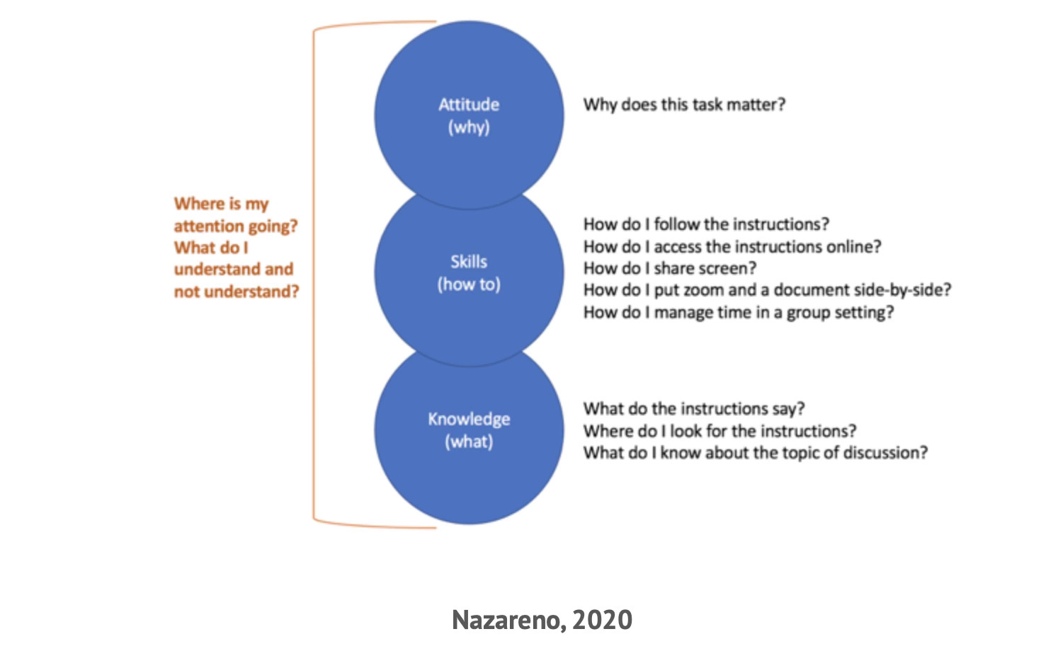 Being online versus in-person is not what caused this sudden confusion, as many factors that influence quality learning are similar regardless of modality (a separate blog by Tracey Tokuhama-Espinosa describes what to consider while moving online1). However, being online unveils some of what gets forgotten about in learning, such as checking for understanding. This becomes exposed because, in cyberspace as we move from one virtual space to another, we might not have the same social cues we are used to. And we might assume we all have the same skills for and ease or comfort in using the many online tools.