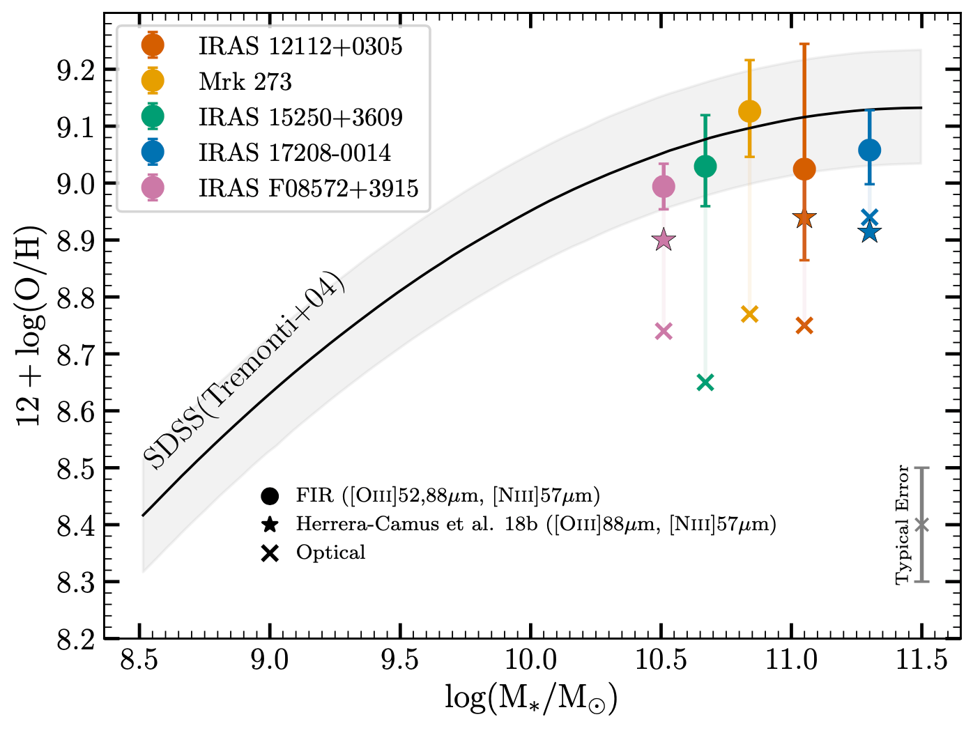 It was later found out that most of these galaxies interact with a nearby companion galaxy, leading astronomers to believe that a high star-formation rate of these objects is triggered by the interaction between galaxies, resulting in gas clouds collapsing and forming new stars. A question astronomers have tried to answer through observations over the last decade is the evolutionary path of these infrared-bright galaxies. One approach is to use bright emission lines to determine the abundances of metal in the interstellar medium. Using emission lines in the optical part of the spectrum, astronomers found that the metal abundance of these objects is less than half of that found in galaxies of similar mass (0.3-0.4 dex offset), but are not rapidly star-forming like these IR bright galaxies. The optical emission lines, however, are obstructed by dust, and therefore could miss extremely dusty regions important for ultra-infrared luminous galaxies.