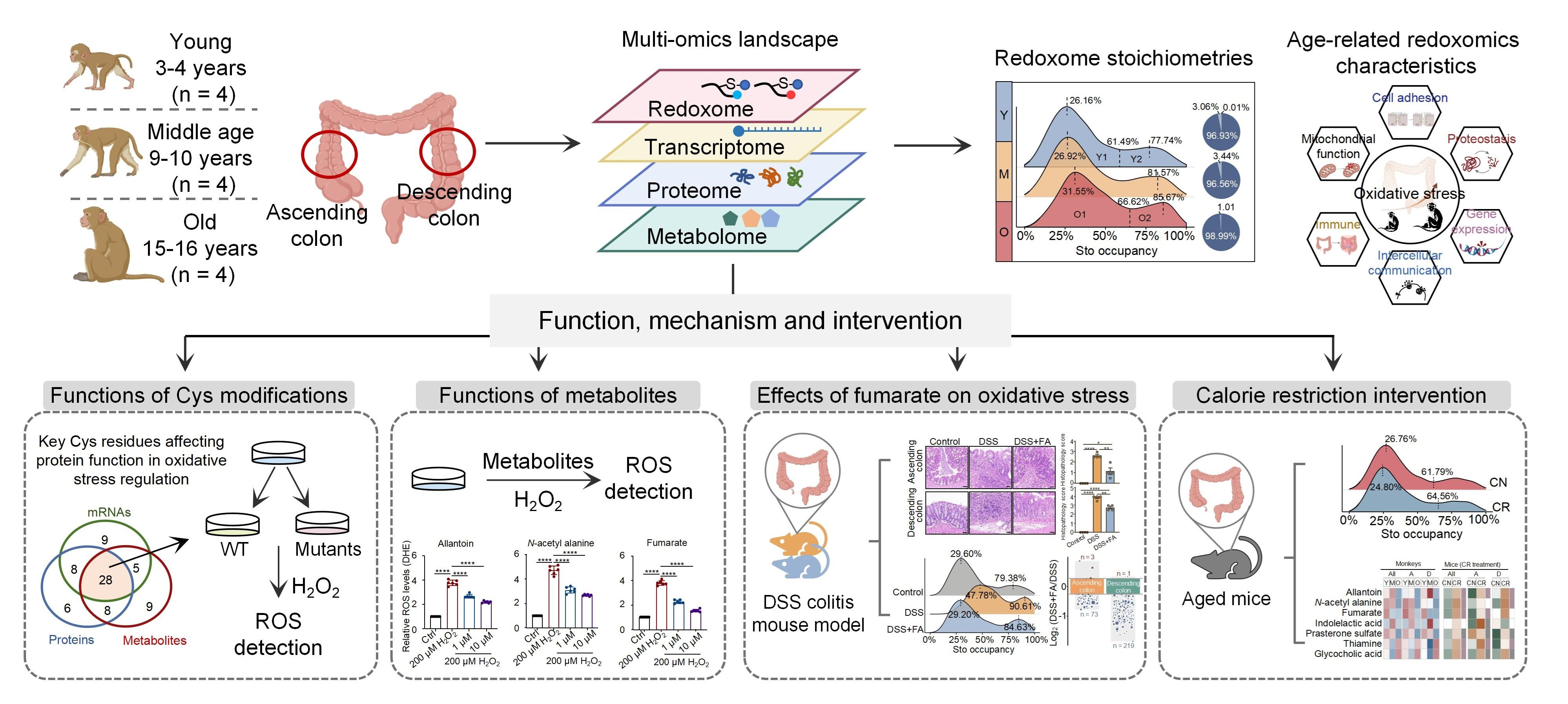 Oxidative stress, resulting from an imbalance between oxidative and reductive processes, plays a pivotal role in aging and age-related diseases1. The gut, a complex ecosystem, is particularly vulnerable to oxidative stress with age. Elevated levels of reactive oxygen species (ROS) and diminished antioxidant defenses compromise gut barrier integrity, alter the microbiota, and impair immune function2, which contributes to gut dysfunction and diseases. Cysteine, an amino acid with a highly reactive thiol group, is particularly sensitive to oxidative stress. As ROS accumulate with age, cysteine modifications undergo reprogramming. However, the patterns of these modifications over time, their functional implications, and the key regulatory factors of oxidative stress and cysteine modifications remain poorly understood.