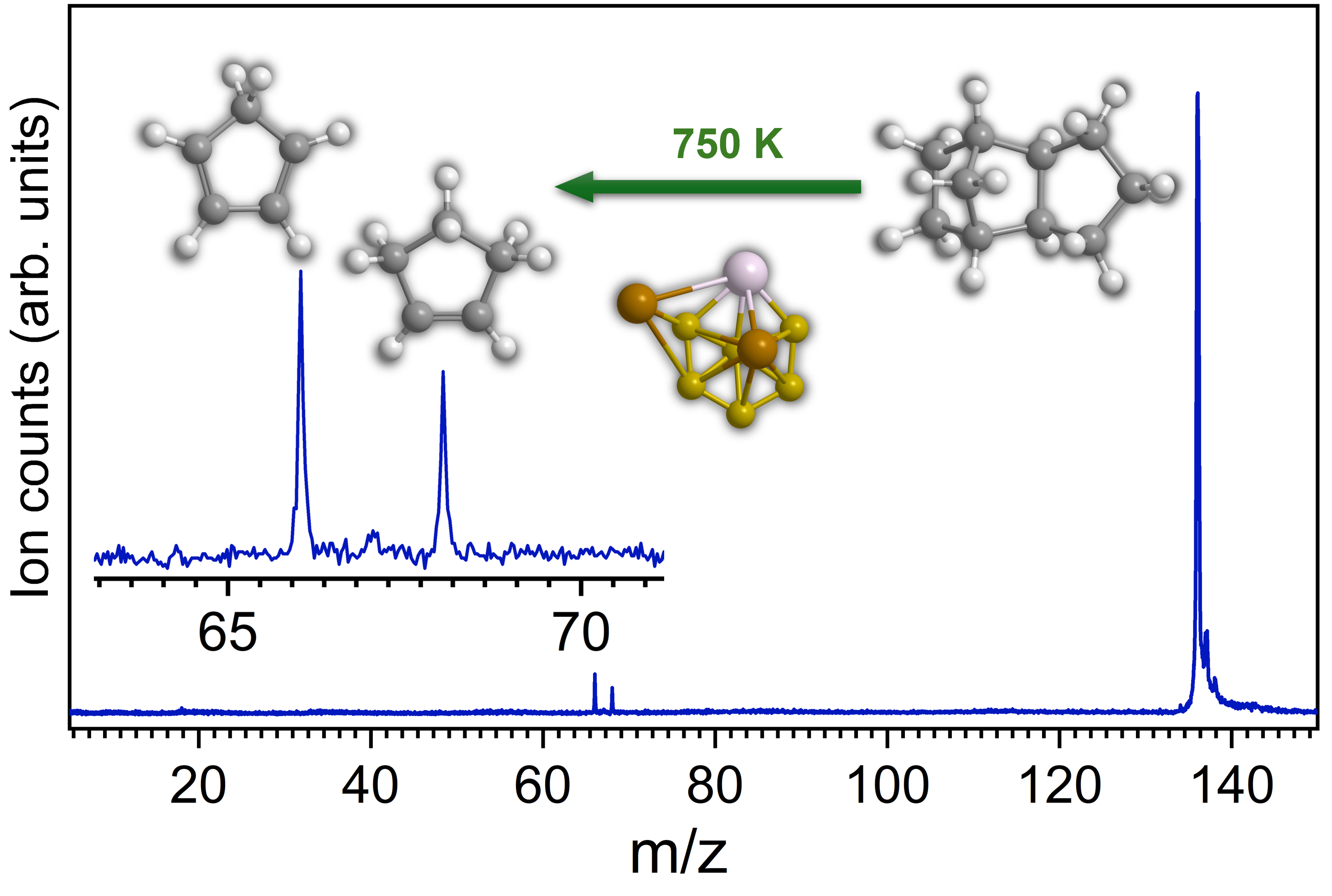 Eventually, our study revealed an initial decomposition of exo-C10H16 at 750 K yielding cyclopentadiene (C5H6) and cyclopentane (C5H8) along with molecular hydrogen (H2) in presence of TiAlB NP (Fig. 1), while the uncatalyzed pyrolysis starts at 1200 K. In addition, the full decomposition of the hydrocarbon occurred at 1050 K instead of 1600 K for the pyrolysis event. Further, utilizing a model cluster of the catalyst from a comprehensive electronic structure theory calculation, the reaction mechanism of the initial steps was unfolded, which occurs via dehydrogenation followed by retro Diels Alder reaction. The initial barrier for the C─H activation has been computed to be only 83 kJ mol-1 compared to 400 kJ mol-1 in case of uncatalyzed homolytic C─H cleavage. Each of the elements had been found to play a specific role: Ti, although insensitive to C─H activation in its metallic state, initiates the catalysis via chemisorption (‘docking’) of the hydrocarbon, adjacent B centers readily abstract hydrogen atoms and store them during the catalytic cycle, while Al stabilizes the catalyst structure yet providing space for critical docking sites for the departing hydrocarbons.