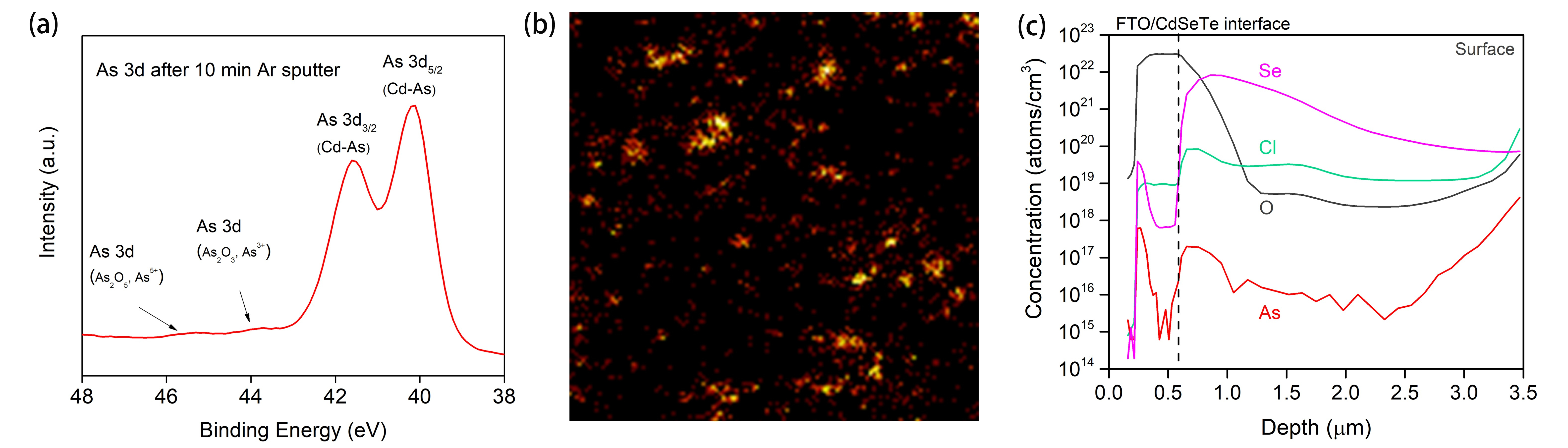 Figure 2 (a) XPS analysis of the chemical state of As ions in the As doped CdSeTe after 10 min (~10 nm) Ar pre-sputter etching. (b) 2D As distribution mapping and the (c) dynamic-SIMS depth profiles for the As doped CdSeTe device.
