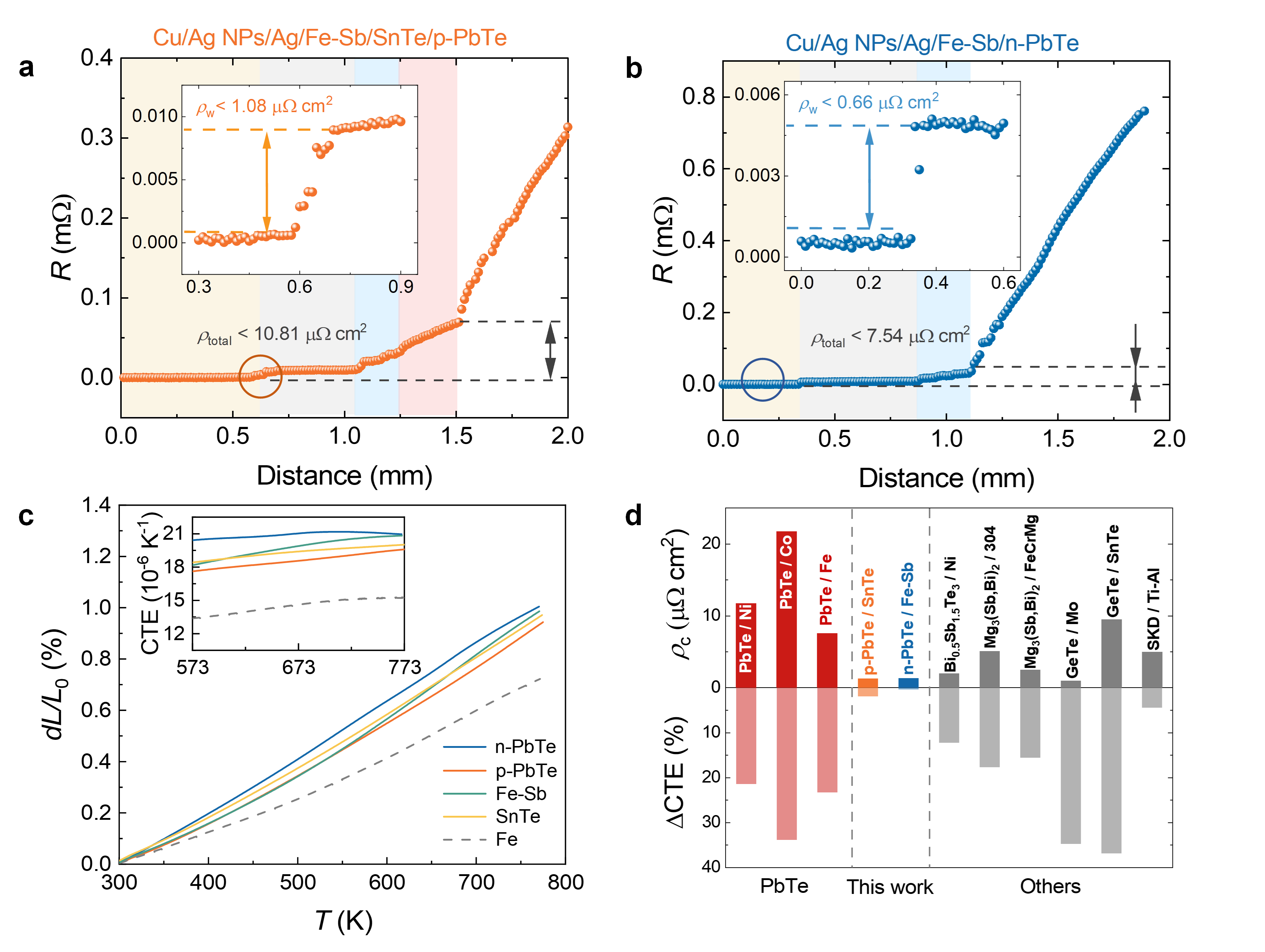 Figure. 2 | Characterization of the PbTe-based module connection layer. Measured contact resistivity (ρc) after Ag NP sintered bonding for the (a) p-type and (b) n-type junctions. Insets to (a) and (b): magnified images of the Ag NP sintered interface for the p-type and n-type junctions marked with circles, and the welding contact resistivity (ρw). (c) Temperature-dependent expansion behaviors of PbTe and connection materials in the range 293-773 K. Inset: CTE variation of the corresponding materials at 573-773 K. (d) Contact resistivity (ρc) and ∆CTE for this connection design in comparison with those from other reports.
