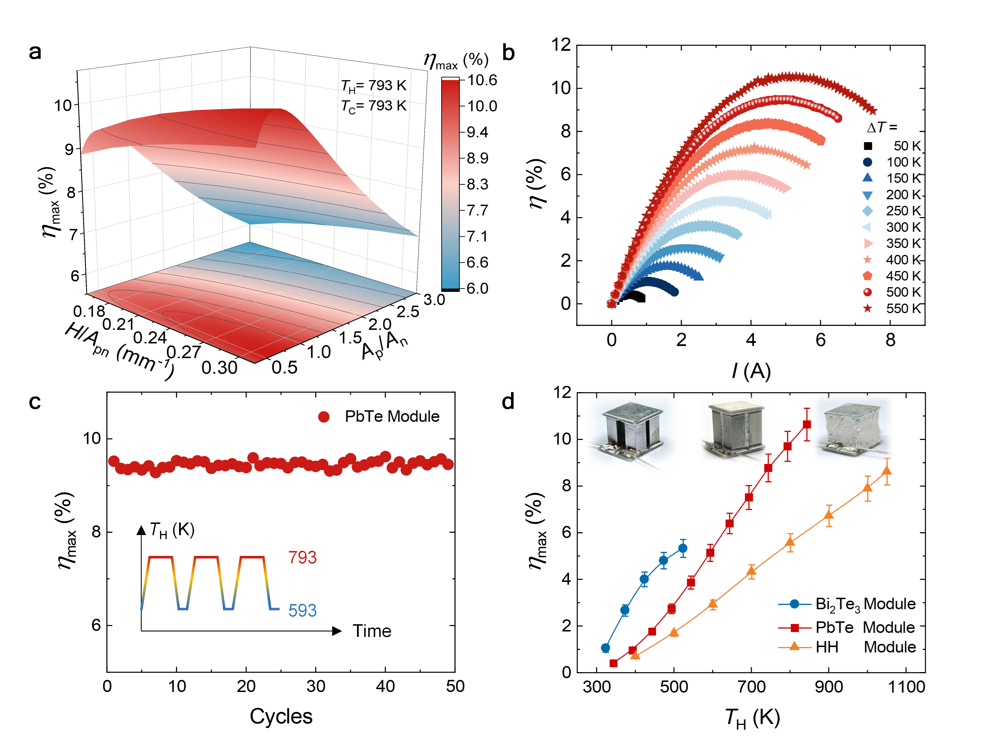 Figure. 3 | Performance of the thermoelectric modules. (a) Finite-element-simulated maximum efficiency (ηmax) as a function of the cross-sectional area ratio of the p- and n-type legs (Ap/An) and the ratio of height to the total cross-sectional area of the legs (H/Apn). (b) Measured conversion efficiency as a function of current at different hot-side temperatures. (c) ηmax of the PbTe-based module throughout thermal cycling between hot-side temperatures of 593 and 793 K. Inset: schematic illustration of the thermal cycling over time. (d) Maximum conversion efficiency (ηmax) as a function of hot-side temperature for the Bi2Te3-based, PbTe-based, and half-Heusler-based modules. Insets: optical images of (left to right) the Bi2Te3-based, PbTe-based, and half-Heusler-based modules.