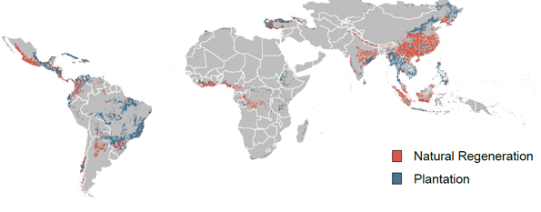 In our newly published paper in Nature Climate Change, we determined where it is more cost-effective to establish tree plantations (which can generate income from harvested wood products), and where it is more cost-effective to let forests regrow naturally (and in doing so provide natural habitat for plants and animals). We did so by integrating hundreds of observations on the costs of reforestation projects with other biophysical and economic data.