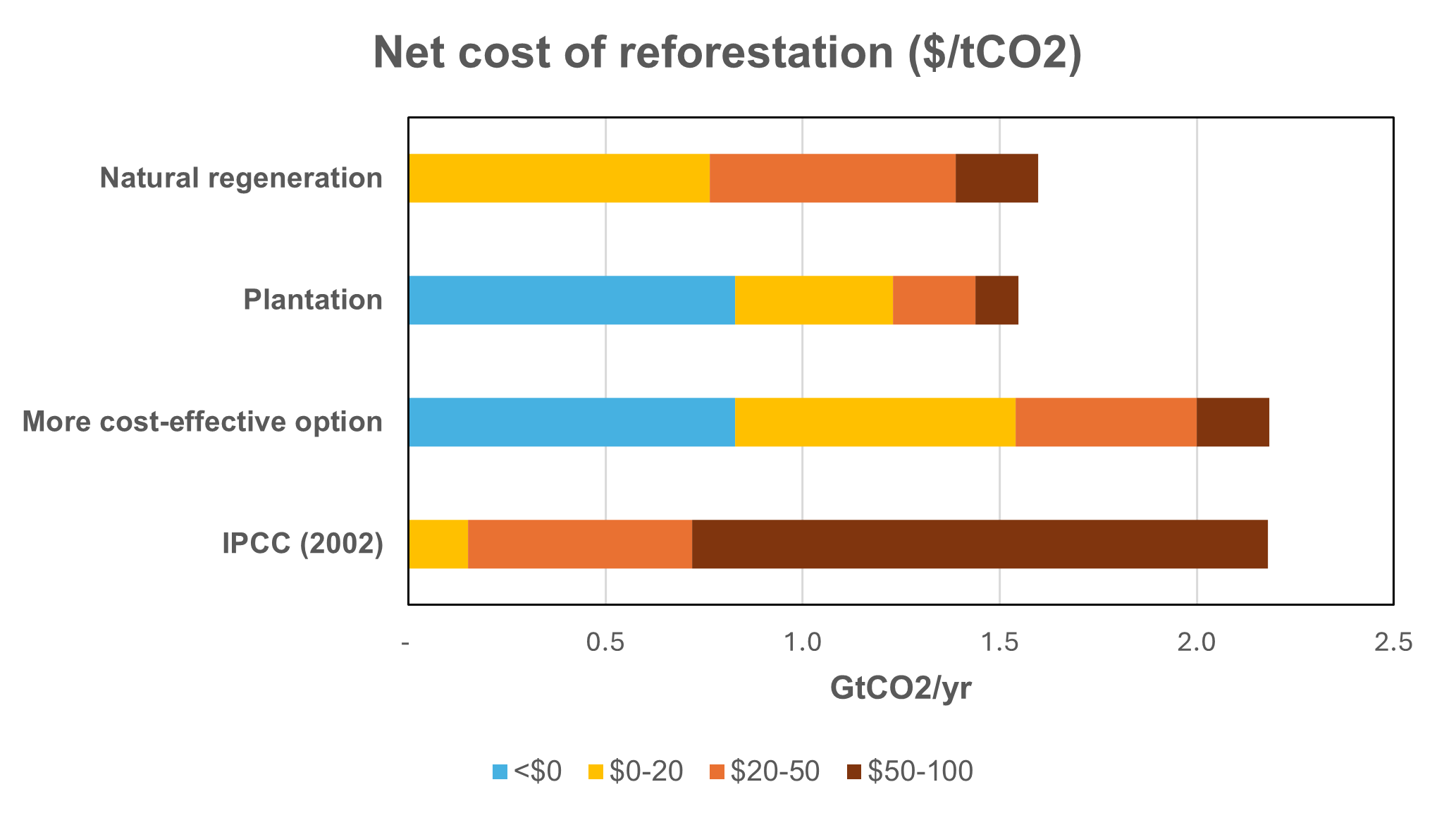 By combining natural regeneration and plantations and applying each method where it is more cost effective, reforestation can achieve considerably more mitigation at a given cost than previously estimated by the IPCC. Reforestation could remove more than ten times as much carbon dioxide below a cost of $20/tCO2 than previously estimated, or nearly three times as much below a cost of $50/tCO2 (Fig. 3). The potential for more low-cost mitigation from reforestation implies that reforestation can play a larger role in climate mitigation efforts than previously considered.