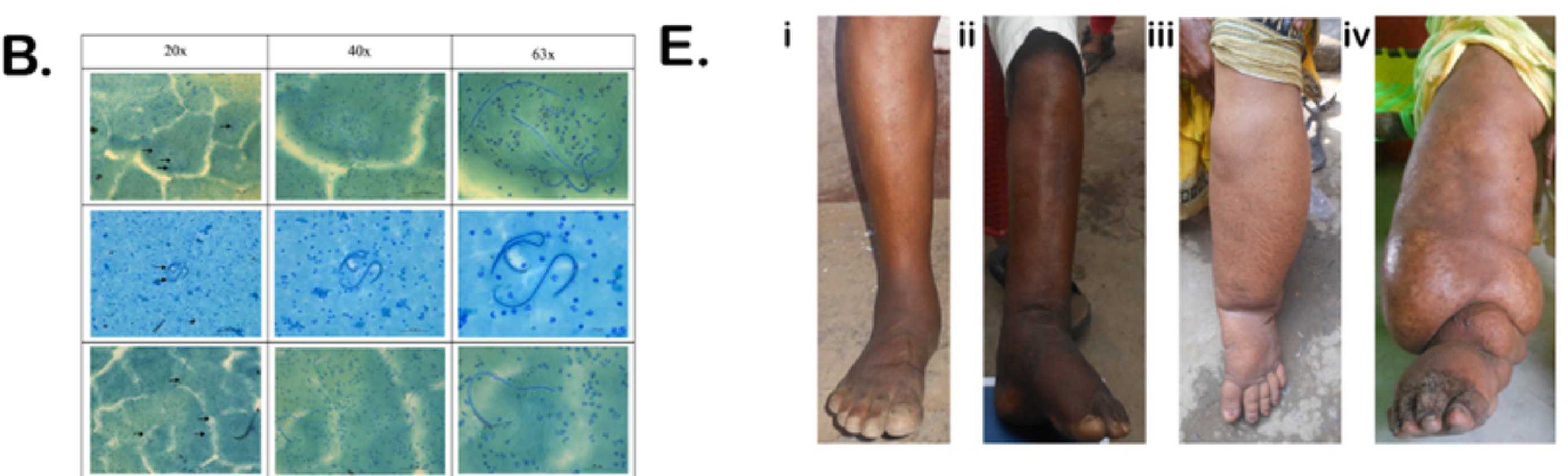 (B) Microscopy slides of infected pateint blood smears showing W. bancrofti microfilariae, and (E)Classification of chronic manifestations of lymphedema into four grades with increasing severity; (i) Grade I, (ii) Grade II, (iii) Grade III and (iv) Grade IV. Modified from: Chakraborty et al., 2026