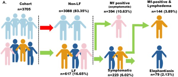 Diagrammatic representation of the study cohort (n=3705), with individuals categorised into LF cases (n=617) and non-LF (n=3088). Among the 617 LF cases, 394 (10.63%) were asymptomatic mf-positive (microfilaraemia-positive) individuals, meaning that the microscopic microfilariae (mf) parasite larvae were detected in the blood. Symptomatic cases, on the other hand, were 223 (6.02%). The symptomatic group included 144 individuals (3.89% of LF population) with circulating mf, filaria-specific antibodies, and clinical symptoms, while 79 individuals (2.13% of LF population) were deemed to have “elephantiasis”. Modified from: Chakraborty et al., 2026