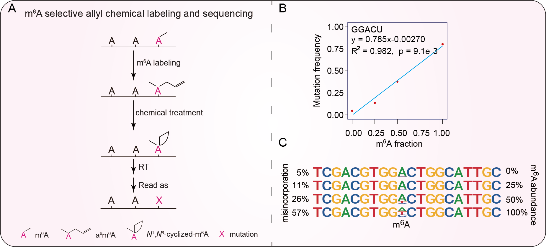 Schematic diagram of m6A-SAC-Seq. A: MjDim1 uses allylic-SAM as a co-factor to label m6A to allyl6m6A, which undergoes cyclization upon I2 treatment. Cyclized a6m6A induces mutation using HIV reverse transcriptase during reverse transcription. B: Calibration curve for each GG(m6A)CU motif is generated by linear regression. P-values and goodness of fit (R2) of linear regression were also shown. C: Examples of mutation pattern of an m6A-modified 41-bp spike-in probe with 0%, 25%, 50%, 100% of m6A, respectively.
