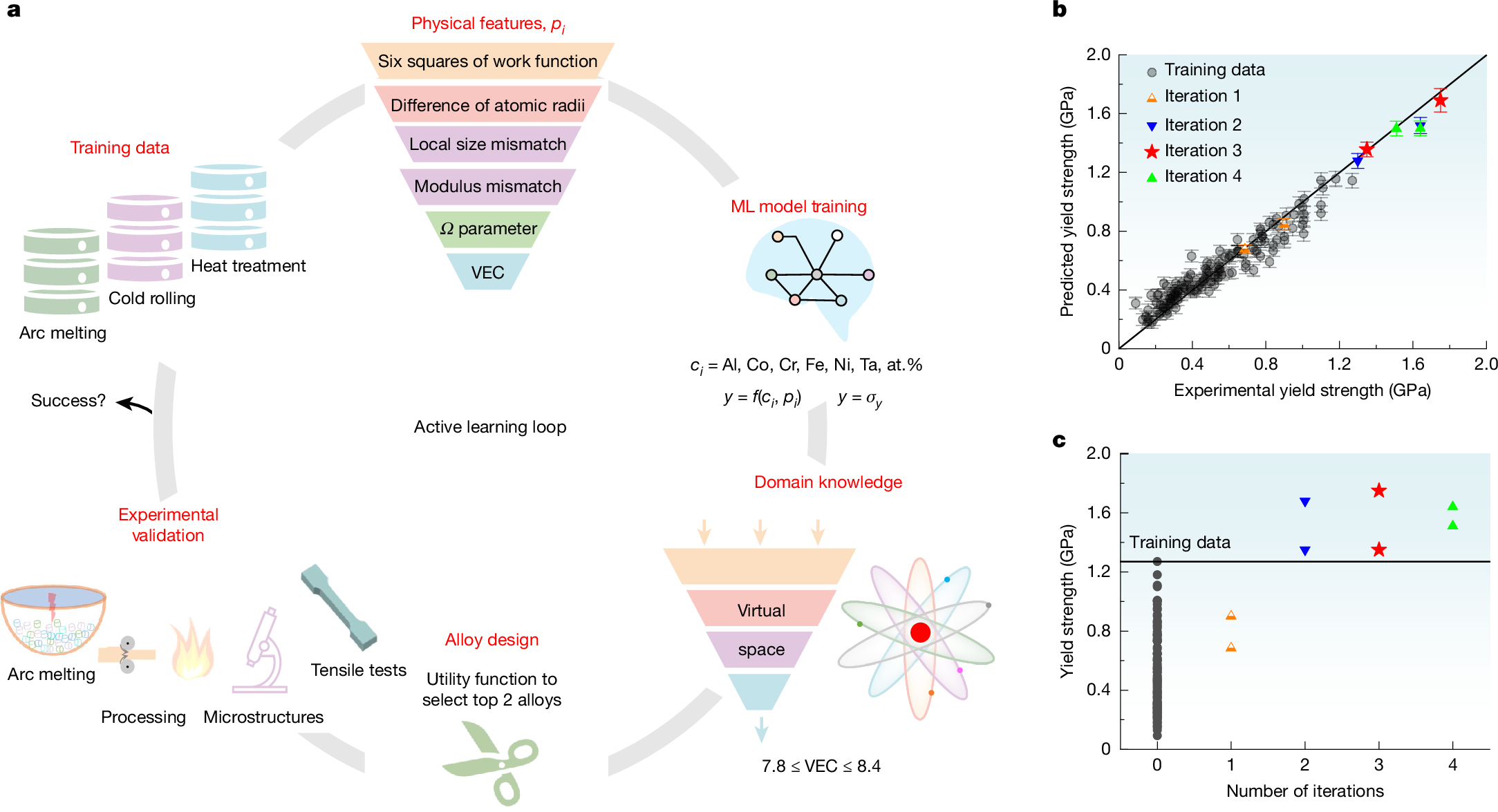Figure 1: (a) Domain knowledge-based machine learning model (active learning loop consisting of six steps) predicting FeNiCoAlTa complex alloy with superb plasticity, (b) theoretical prediction of yield strength matching with experimental measurement of yield strength confirming the reliability of the machine learning model, and (c) experimental measurement of yield strength versus the number of iterations of the model, which reveals the optimal composition of the Fe35Ni29Co21Al12Ta3 complex alloy.