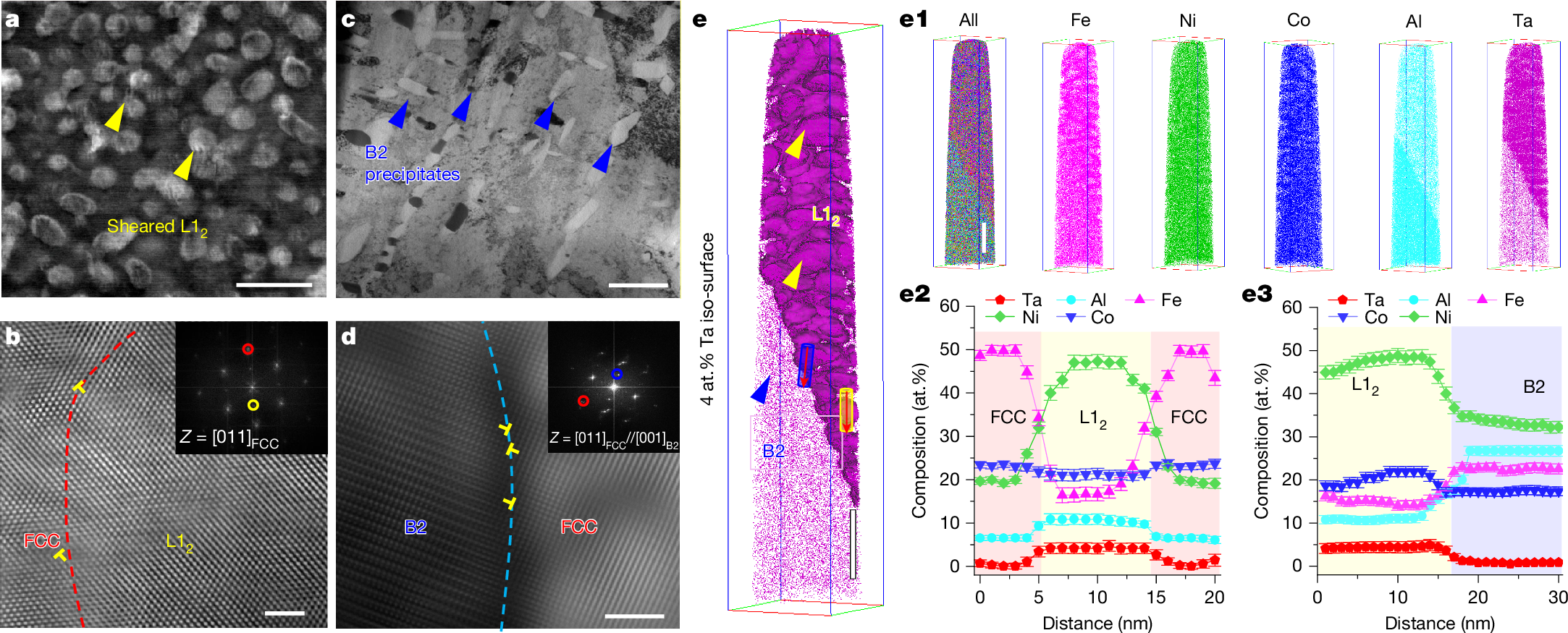 Figure 2. (a-d) Room temperature deformation and interfacial characteristics of Fe35Ni29Co21Al12Ta3 complex alloy with triplex structure, i.e., dislocations are able to cut through the L12 nanoparticle and are stored in the low-modulus B2 micrometer phase, and dislocations are present at both the L12/FCC coherent interphase and the B2/FCC non-coherent interfaces; (e) Atom probe analysis of the chemical composition and distribution characteristics of the complex alloy, and the elemental composition of the multicomponent L12 nanoparticle and B2 micrometer phase.
