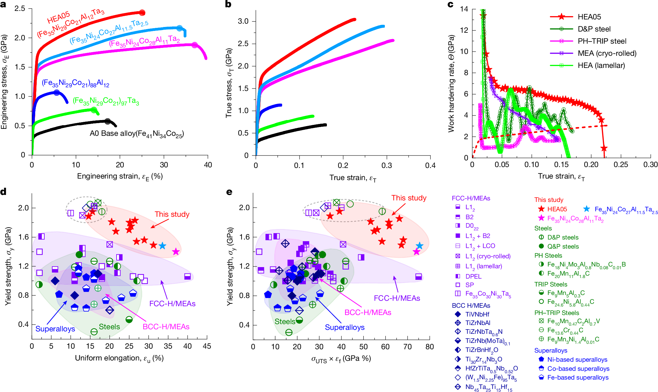 Figure 3. (a-b) Engineering stress-strain and true stress-strain curves of complex alloys with different compositions, (c) work-hardening properties of Fe35Ni29Co21Al12Ta3 complex alloy in comparison with other 2GPa-class ultra-high-strength metallic materials (D&P steels, martensitic steels, and medium- and high-entropy alloys), (d, e) Fe35Ni29Co21Al12Ta3 complex The yield strength-uniform tensile elongation comparisons and yield strength-product of tensile strength with elongation comparisons of the alloys significantly outperform the combination of room-temperature mechanical properties of other metallic materials reported so far when compared with other metallic materials.