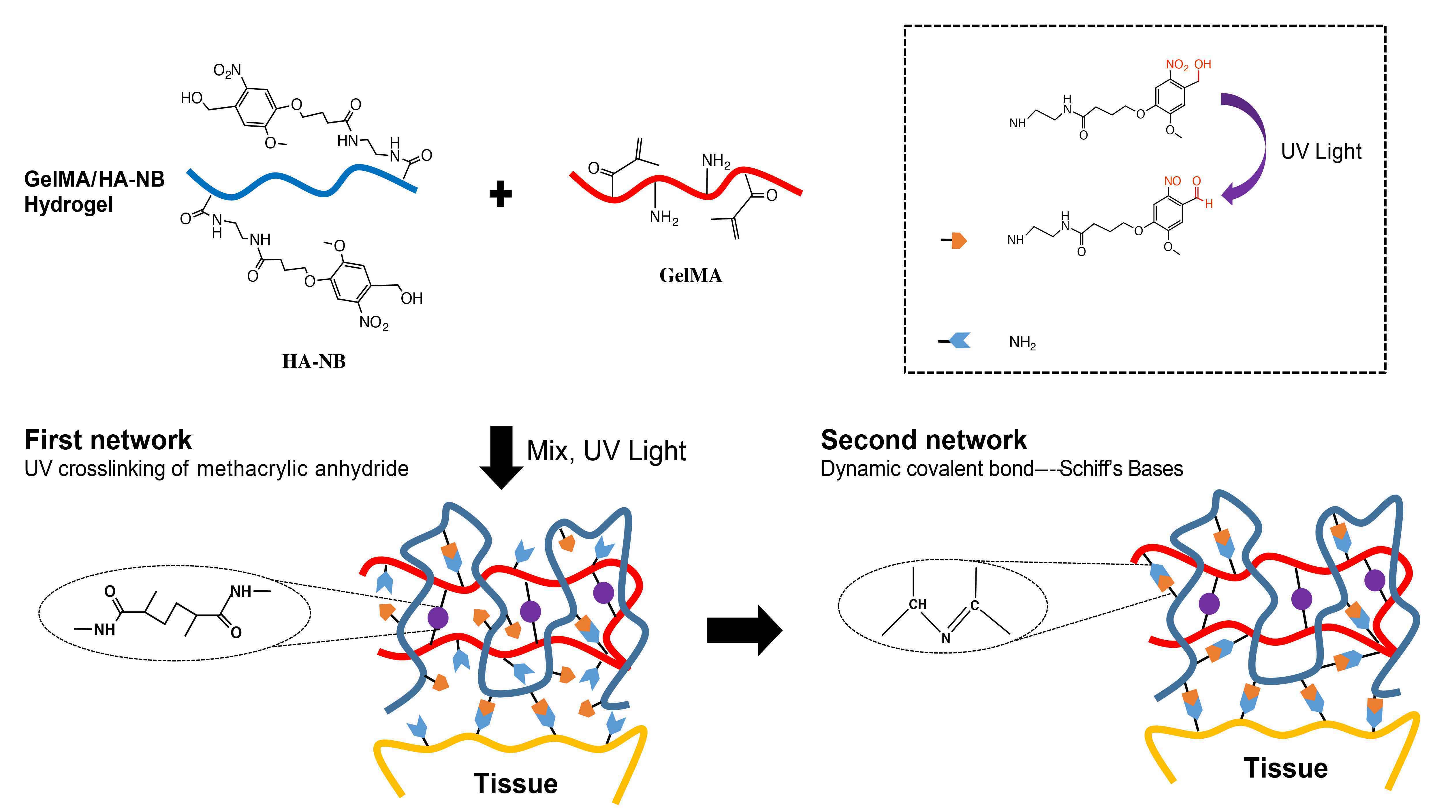 To overcome these challenges, our lab has been working hard to design a tissue-adhesive hydrogel that meet the following needs: 1. strong wet and dynamic tissue adhesion; 2. suitable mechanical property; 3. good biocompatibility; 4. easy to use. We realized that the human body is the most amazing material created by nature, therefore we chose human tissue components as basic materials, and have tried multiple crosslinking strategies to seek a biomimic tissue-adhesive hydrogel. After screening a large amount of material, we noticed that a novel small molecule (NB: N-(2-aminoethyl)-4-(4-(hydroxymethyl)-2-methoxy-5-nitrosophenoxy) butanamide)5synthesized by Zhu’s lab could help us achieve the goal. This small molecule could generate aldehyde group after UV irradiation and it could bond to tightly to tissues through Schiff base reactions. So, we contacted Prof. Linyong Zhu and teamed up with him to design the current project involving this small molecule published on Nature Communications.