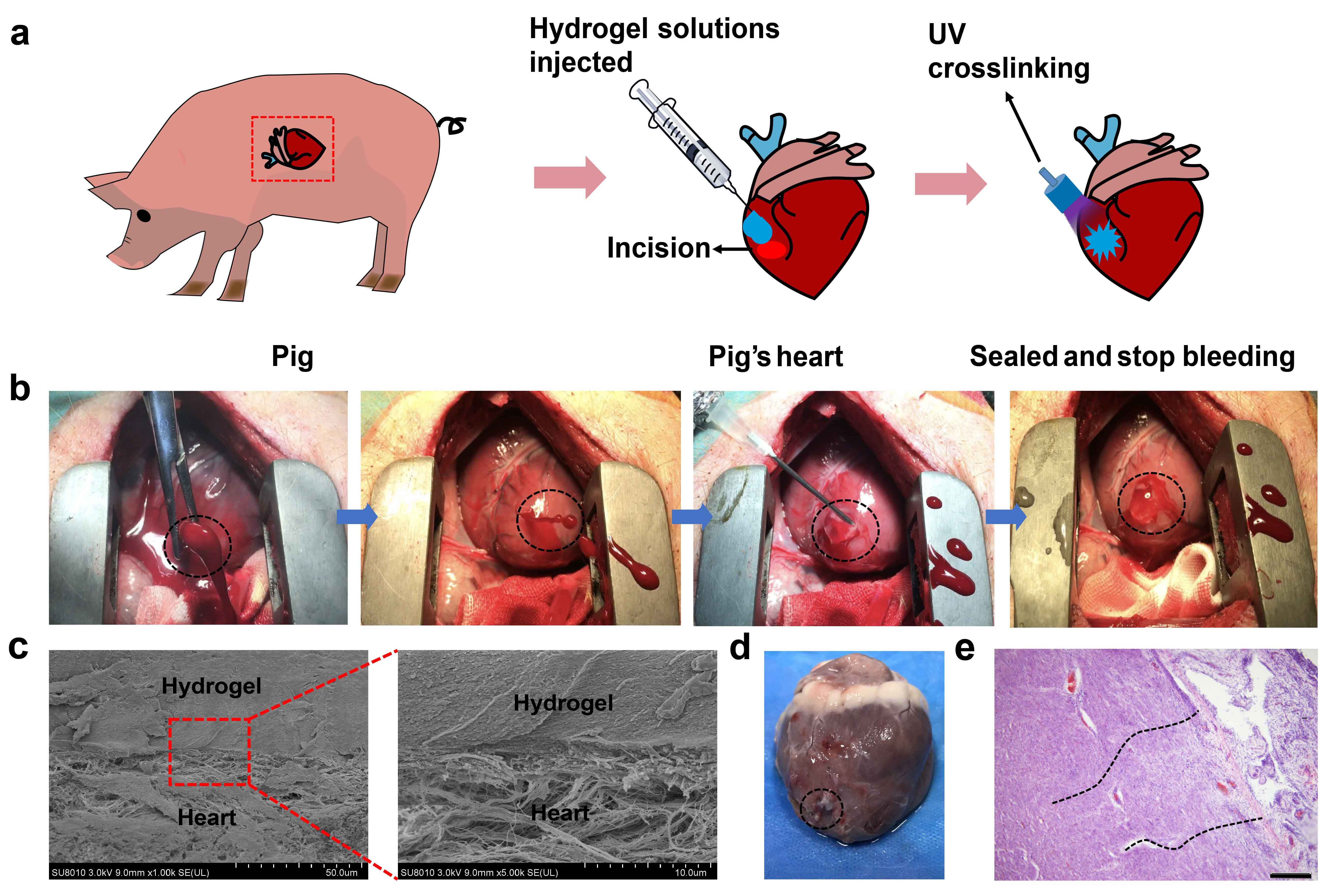 After achieving amazing results in small animal models (rats and rabbits), we next validated the hydrogel’s ability to seal blood leakage on a pid heart penetration model. Heart is the central organ of vertebrate circulatory physiology and when cardiac penetration injuries occur, massive hemorrhage results in lives being lost within a very short time. Our hydrogel can stop high pressure bleeding from pig carotid arteries with 4~5 mm long incision woundsand from pig hearts with 6 mm diameter cardiac penetration holes (Figure 2). Treated pigs survived after hemostatic treatments with this hydrogel, which is well-tolerated and appears to offer significant clinical advantage as a traumatic wound sealant.