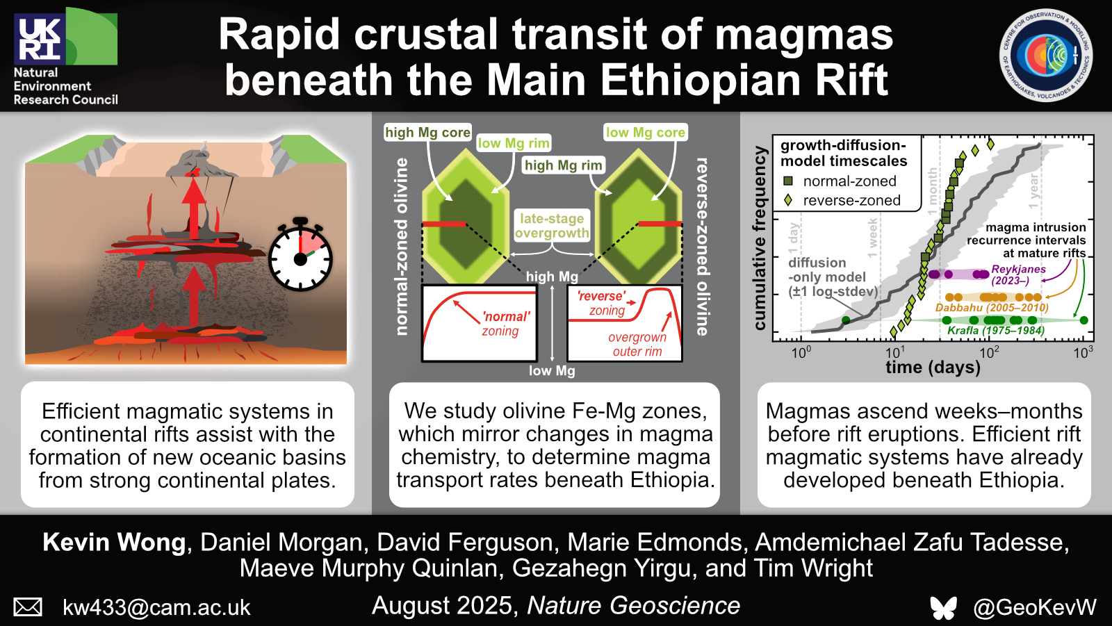 As a final note, I highlight the ongoing magmatic intrusion episode near the Ethiopian rift volcanoes of Fentale and Dofen that initiated last year [3], but has not yet resulted in a volcanic eruption. Interdisciplinary observations of magma movement beneath Ethiopia, collected both through geophysical monitoring of ongoing volcanic phenomena and through geochemical analysis of erupted materials (as demonstrated here), must therefore continue to be performed to characterise these rift magmatic systems for effective volcanic risk assessment.