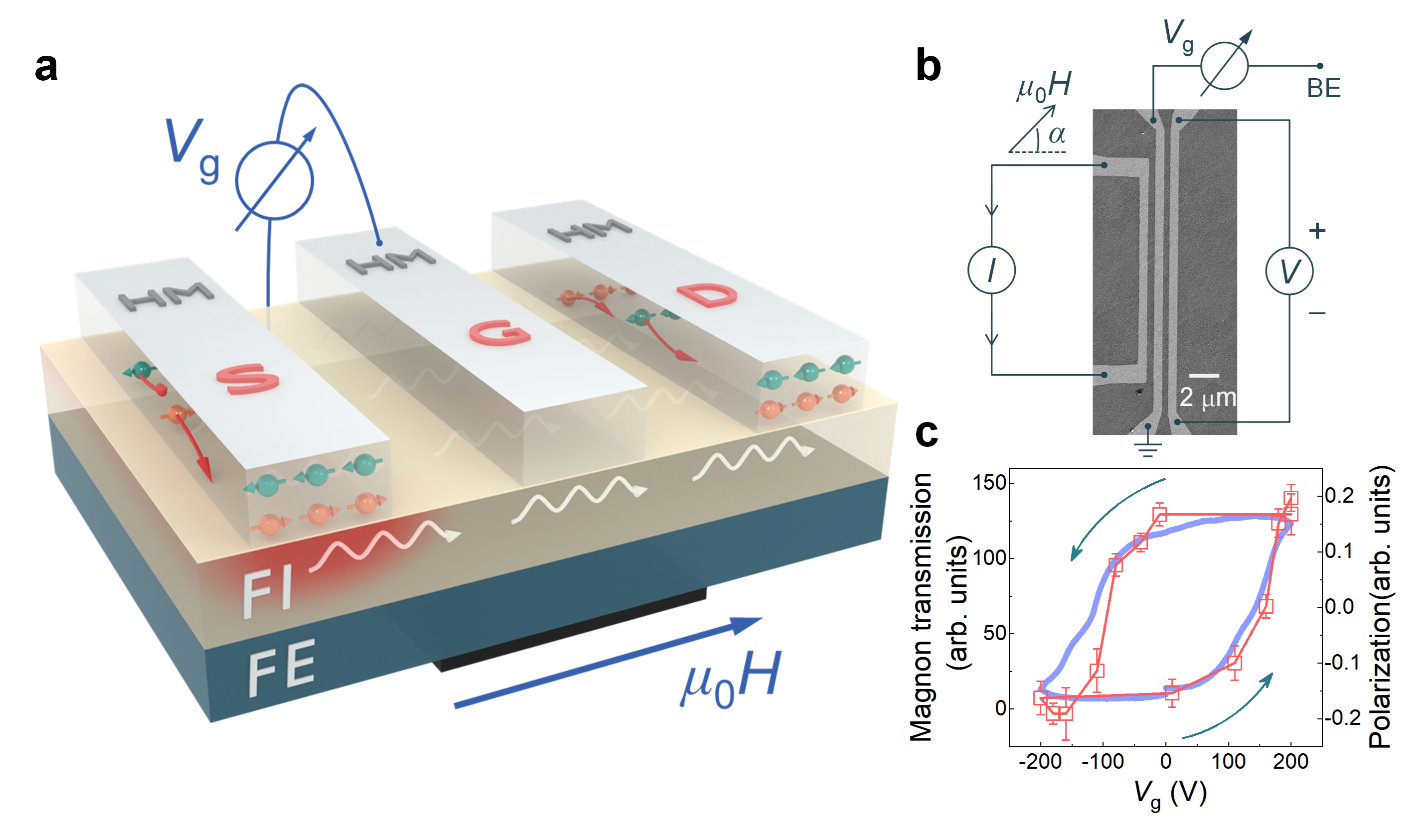 Fig. 1 | a Sketch of a three-terminal magnon field-effect transistor (Magnon FET). Three heavy-metallic (HM) stripes are placed onto a ferromagnetic or ferrimagnetic insulator (FI) /ferroelectric (FE) bilayer. The left stripe acts as the magnon source (S), and the transmission of magnons to the right detector (D) stripe can be modulated by the voltage pulses Vg applied at the middle gate (G) stripe, which is located in the middle. Additionally, a bottom electrode is positioned beneath the FE layer and is aligned with the G-stripe. The magnetic field μ0H is applied in the film plane. b SEM image of a typical three-terminal magnon FET device. c Magnon transmission (red) as a function of the gate voltage pulse Vg, exhibiting a typical hysteresis similar to the polarization loop (blue) obtained on the same sample.