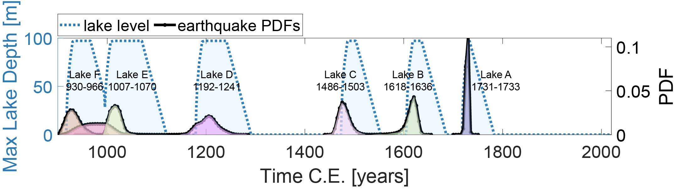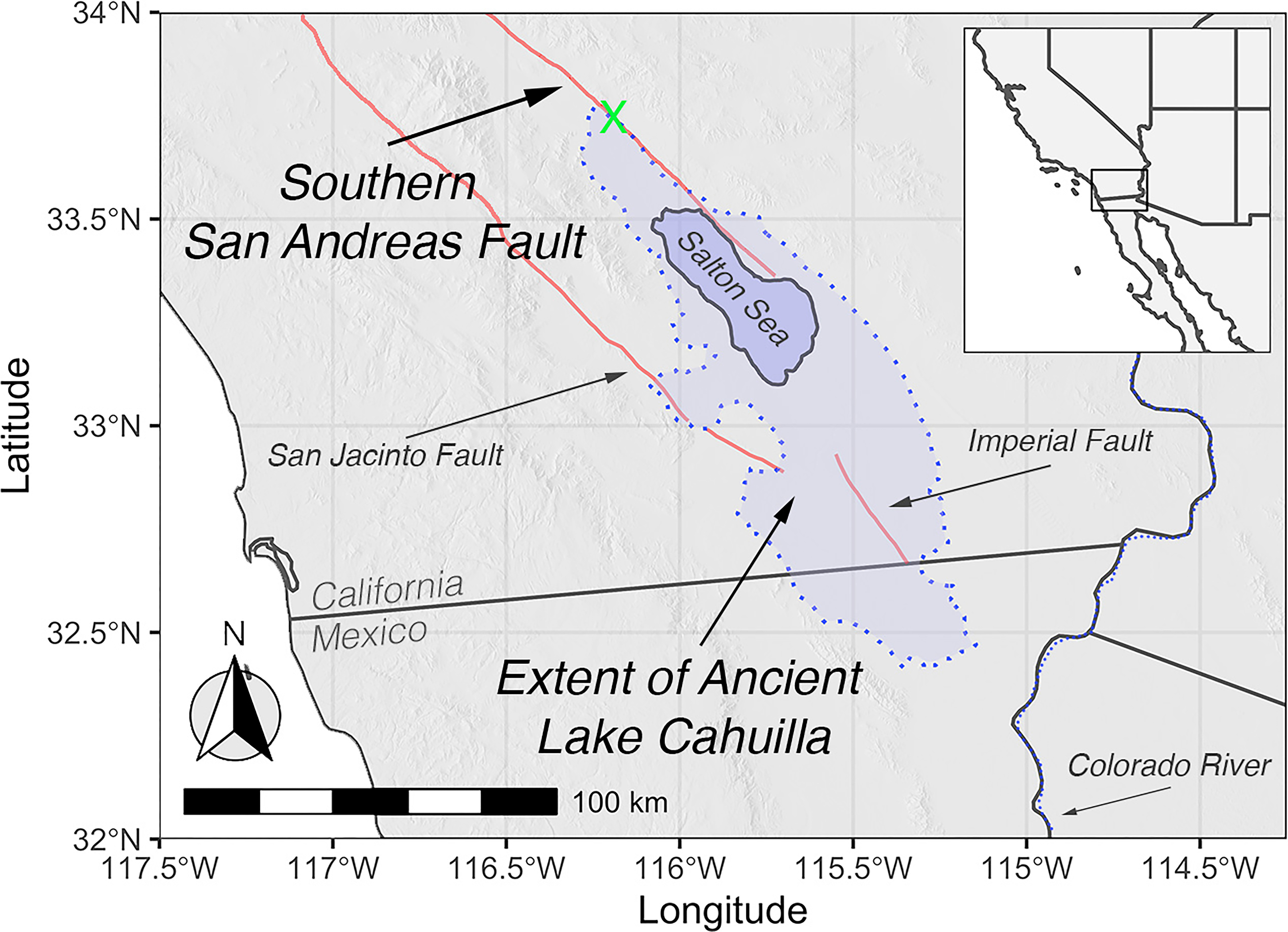The SSAF lies within the Salton Trough, a large pull-apart basin formed by the active tectonics in the region. This basin would periodically fill then dry up as the Colorado River changed its course from filling the basin to draining out into the Gulf of California. This cycle would create a large lake called ancient Lake Cahuilla which was ~x40 larger in volume than its present day remnant, the Salton Sea. Recent advances in the geologic record for both the lake and earthquake timings of the past reveal that over the last millennium ancient Lake Cahuilla formed on 6 separate occasions. More importantly, it coincides with nearly every major event on the SSAF during this time (Figure 2).