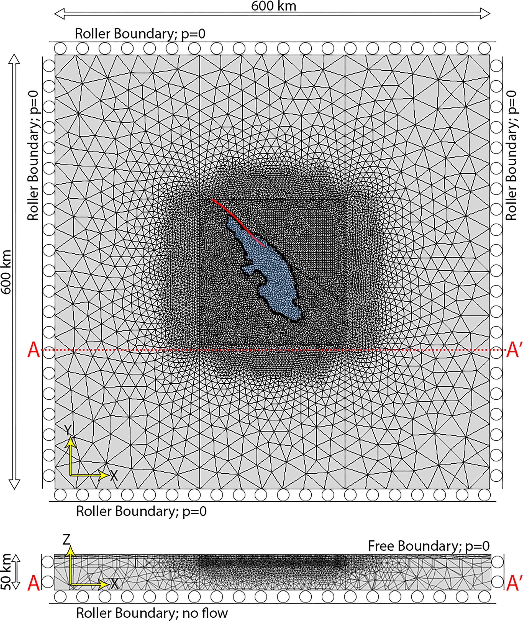 With ~2 million tetrahedrons our finite-element model captures other contributors to 'unclamping' like nonvertical fault dip, permeable damage zone, and lateral pore pressure diffusion. Through modeling lakes over the last 1000 years we determined that while the pressure from the lake on the surface has the greater impact towards destabilizing the SSAF fault both discussed effects interfere with one another simultaneously, raising the pore pressure to high points coinciding with major earthquakes. There is more fascinating info, including the of rate of pressure increase, in the paper!