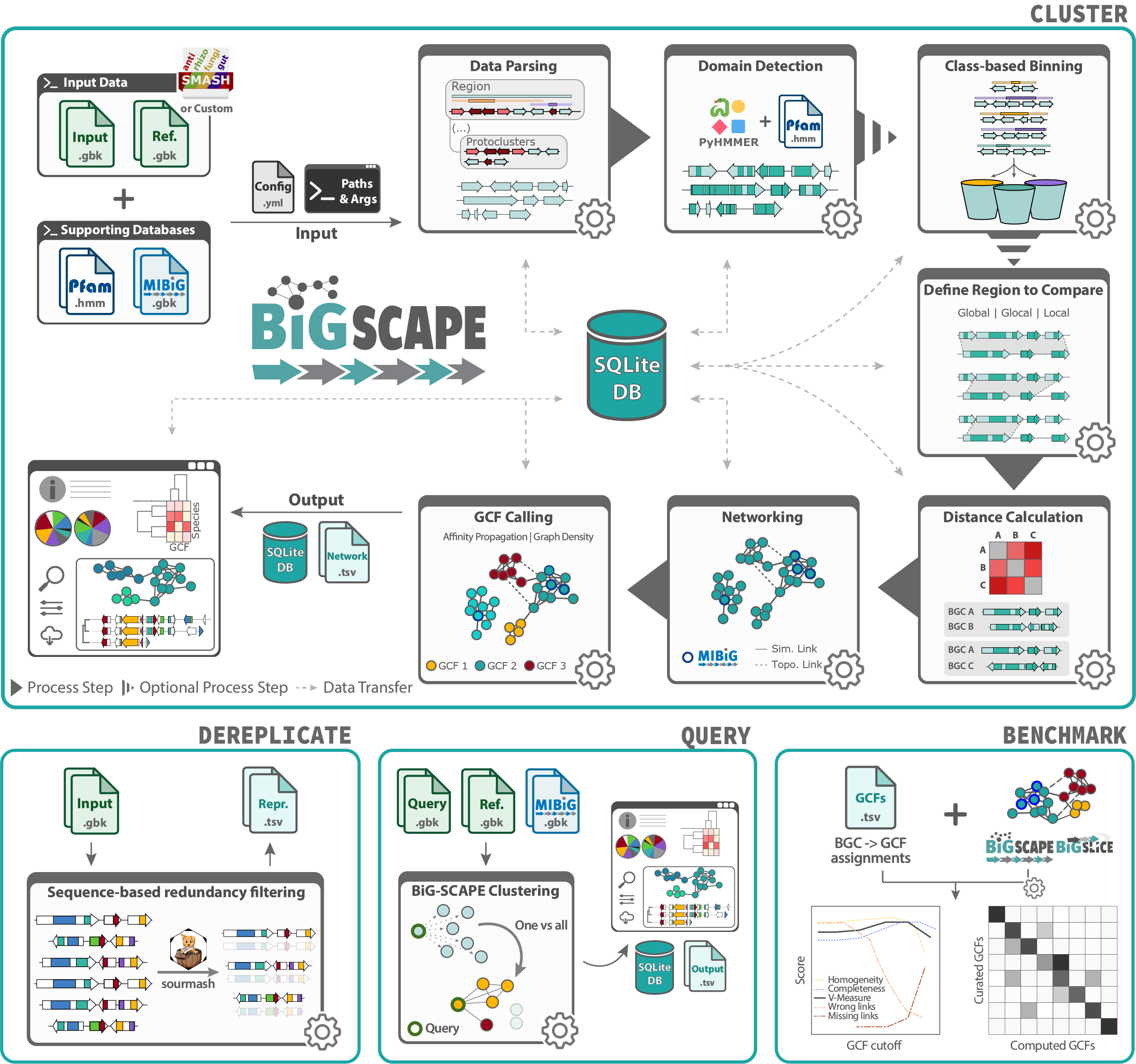 Early on we decided that instead of investing time in tracking down and solving specific scalability bottlenecks in the BiG-SCAPE 1.0 code, we would start from zero, and make use of design principles centered in modularity and interoperability from the get go. We also made updates and introduced new concepts to the biological algorithms of BiG-SCAPE 2.0: we addressed known issues, including improving compatibility with antiSMASH features; we leveraged the antiSMASH region concept for more relevant delineation of biosynthetic regions; and we introduced new alignment modes designed to improve accuracy of the similarity calculations, by improving handling of the challenging and predictive nature of biosynthetic region borders. A change in paradigm, which is central to BiG-SCAPE 2.0, is the extensive flexibility in run parameters that gives the user extreme control over each run. We are excited to see how this customisation potential can be leveraged, and encourage users to go beyond default settings and deeply explore their data.