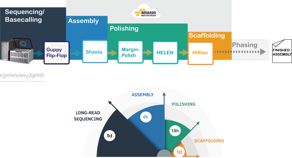 In 2014, the phone-sized, low-cost, Oxford Nanopore MinION was released which democratized third-generation sequencing by making it accessible. In 2017, we participated in an international effort that produced the first reported de novo assembly of a human genome (HG001) using nanopore sequencing. This effort used 53 MinION flowcells, 150,000 CPU hours, and weeks of wall-clock time. While promising, this long-read assembly approach had extensive computational and sequencing requirements5.