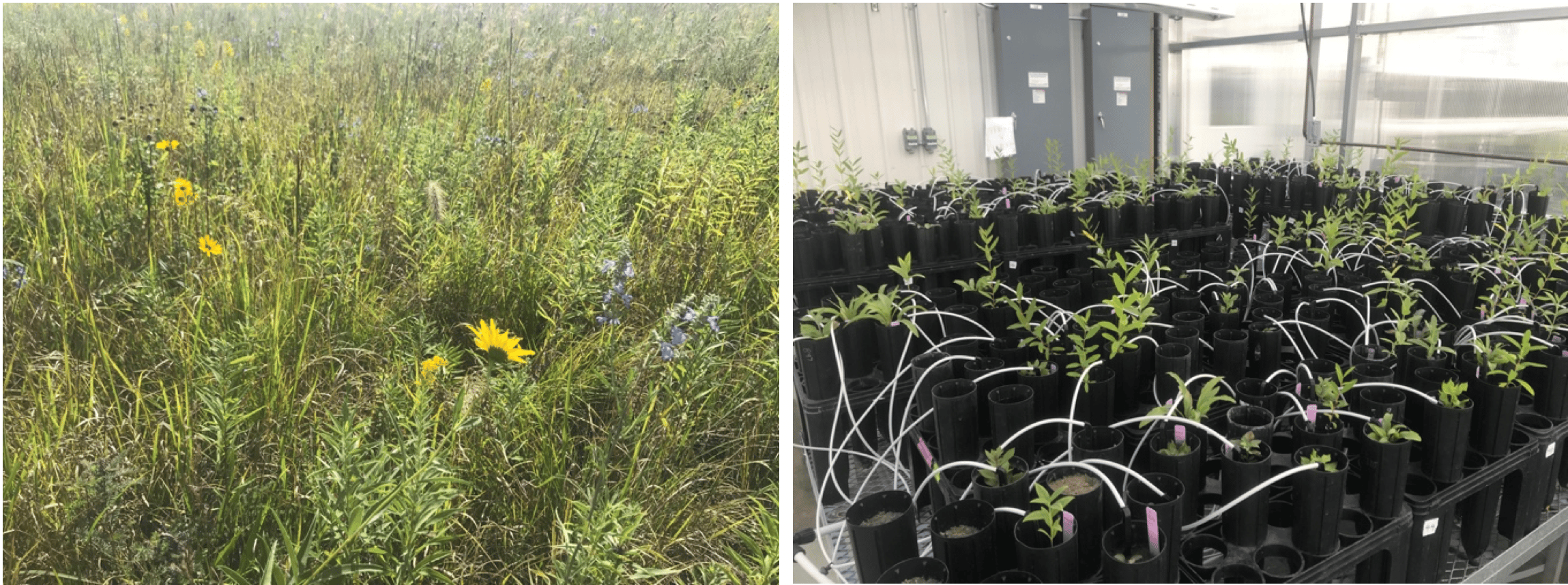 Rockefeller prairie, part of the KU Field Station, and one of our remnant prairie sites; our greenhouse experiment just before harvest.