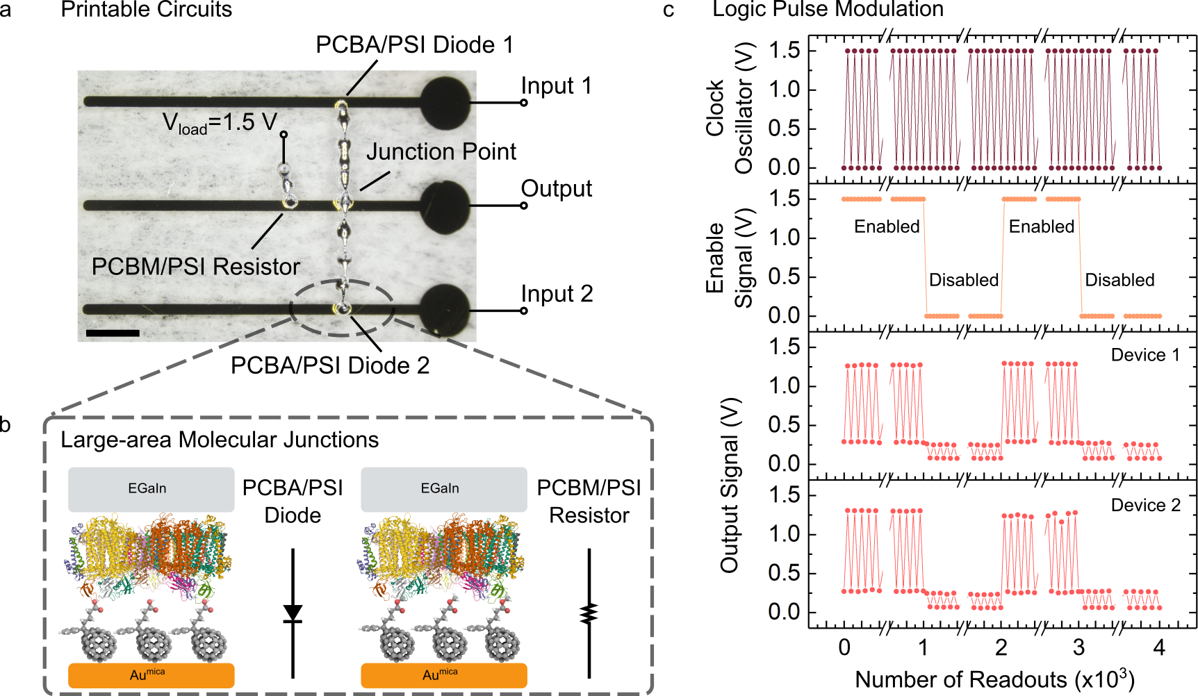 Figure 1 An AND logic circuit (a) comprising two PCBA/PSI diodes and one PCBM/PSI resistor (b) is fabricated by the direct printing of EGaIn electrodes and interconnects. We showed that the logic circuit can modulate electrical pulses at a frequency of 3.3 kHz over 4000 readouts (c).