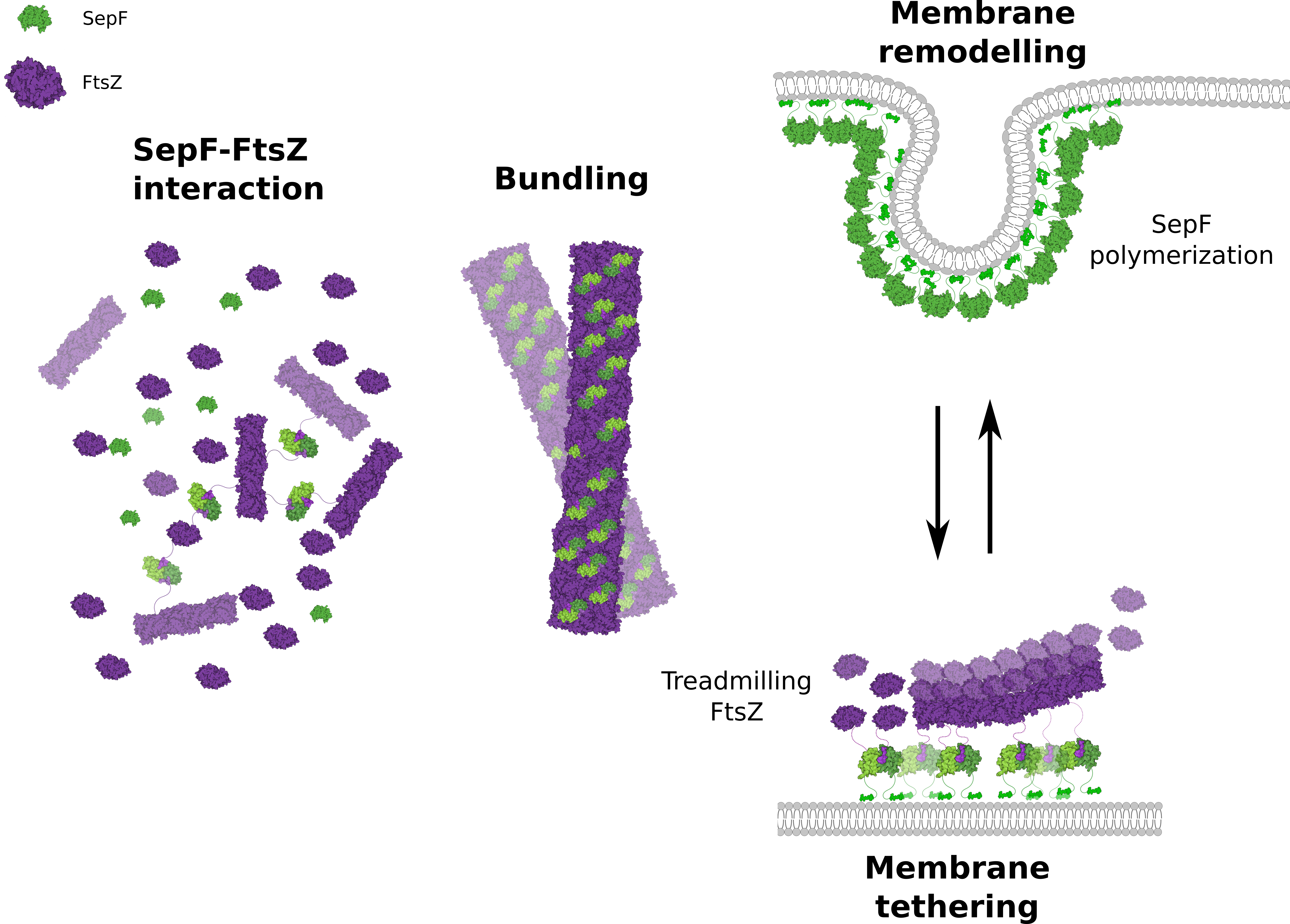 Our work combined biophysics data, structure-driven hypothesis and bacterial genetics to show that SepF is an essential component of the actinobacterial divisome. The protein has a complex role at the division site, participating in FtsZ membrane tethering, FtsZ bundling, and membrane remodeling. Our data suggest that SepF could act as a putative cell division checkpoint protein, participating in membrane constriction only once the divisome is fully functional. More importantly, this work opens new interesting questions: Why in the absence of SepF the cell poles are misplaced (branches)? Why does FtsZ present a non-random distribution in the same conditions, i.e. without its membrane tethering factor? What is the physiological role of SepF-α3? Does it modulate protein-protein interactions? We do not have clear answers for these questions. However, several observations point towards the existence of Actinobacteria-specific FtsZ interactors waiting to be discovered.