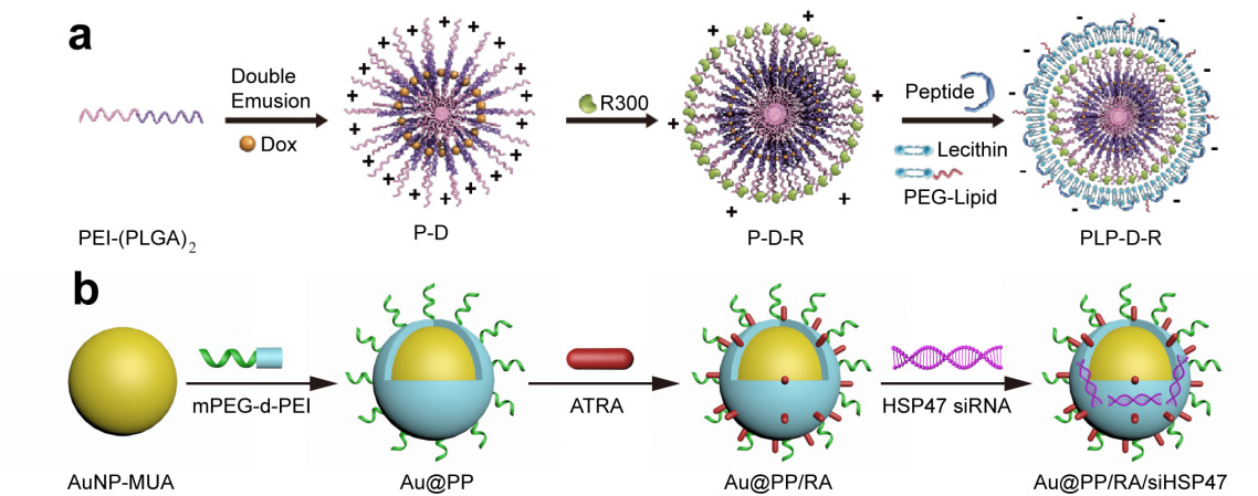 Figure 1. Schematic illustration of PLP-D-R (a) and Au@PP/RA/siHSP47 (b).