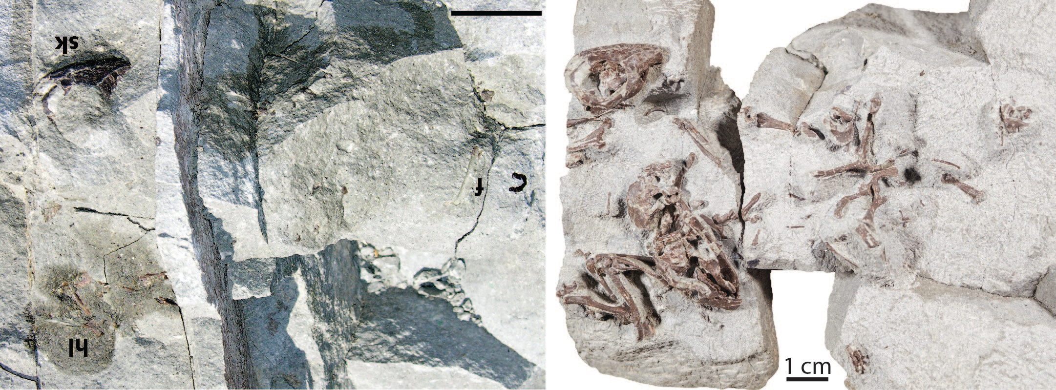 One of the most exceptional Egg Mountain multituberculate specimens, MOR 10908, as it was found in the field (left) and after is was prepared by Bob Masek (right). In these photos you can see the skulls and skeletons of three individuals, including two adults and one  subadult. [Photo credit: Left, Dave Varricchio; Right, Luke Weaver]